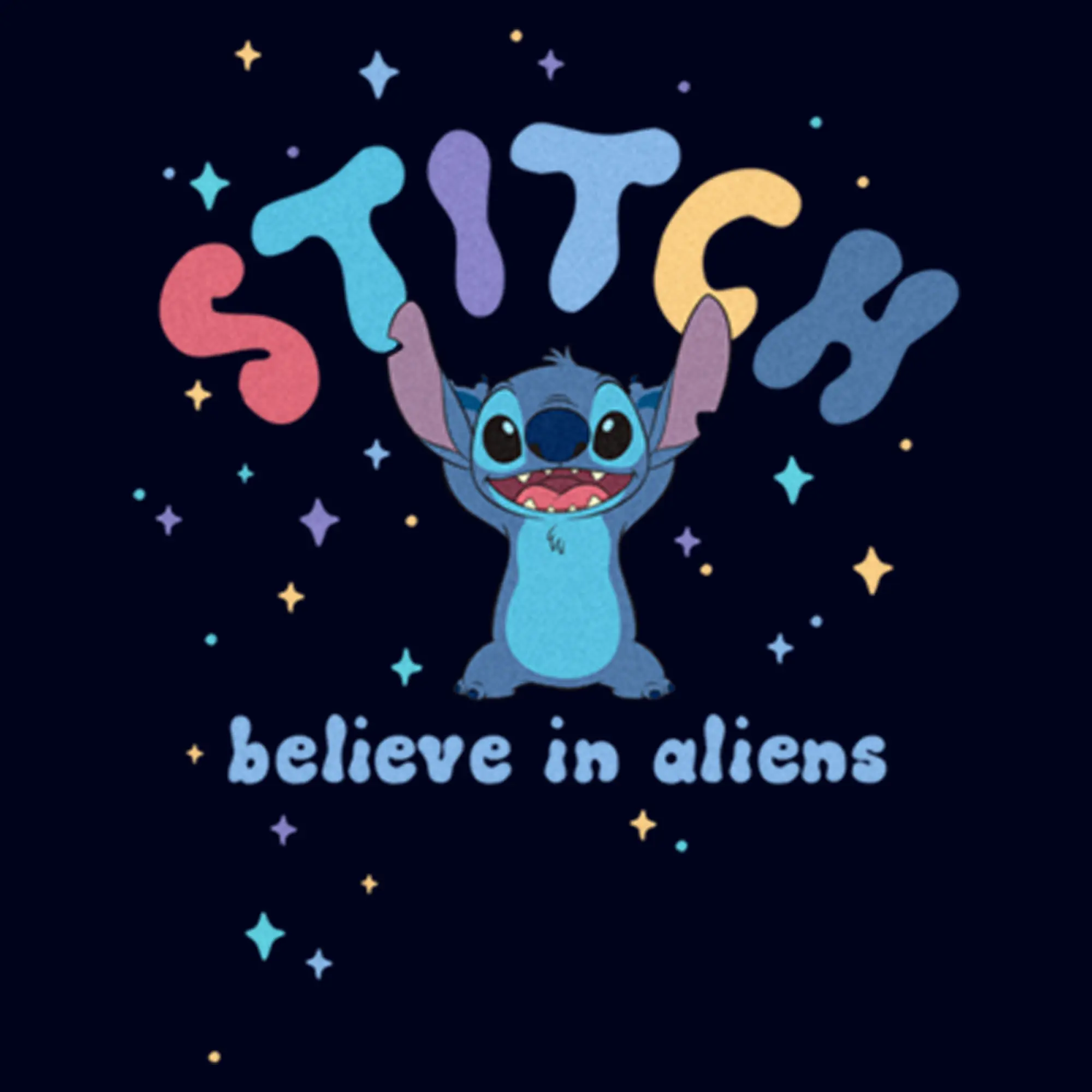 Ohana means family, and family means no tee gets left behind! Find the perfect style with this officially licensed Juniors' Disney Lilo & Stitch Believe in Aliens Stitch Graphic V-Neck Plus Size T-Shirt! This fun design features the adorable extraterrestrial, Stitch, smiling big with multicolored stars and his name printed in colorful letters around him. Celebrate a certain alien, otherwise known as Experiment 626 in style this year with new hilarious apparel from the movie!