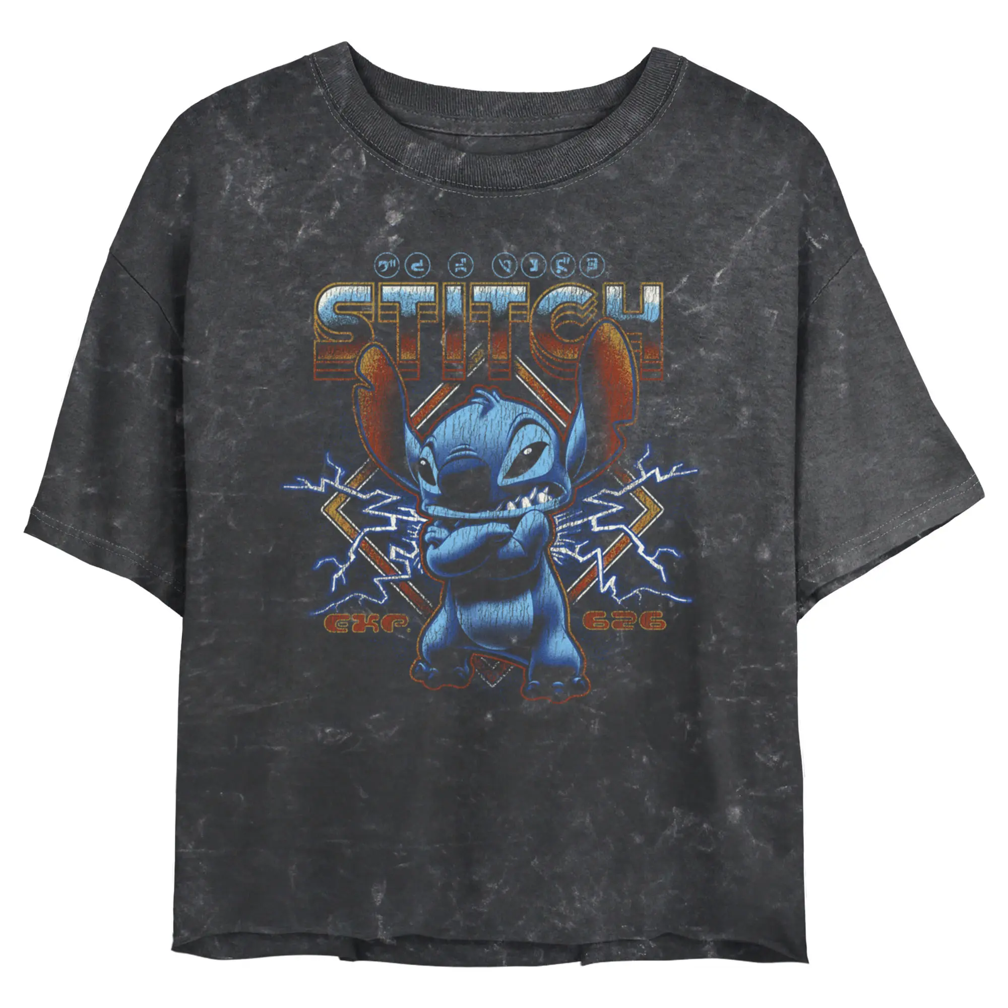 Strut your stuff with this stylish new juniors' crop t-shirt that is perfect for every occasion! Featuring an angry Stitch crossing his arms and showing off his sharp teeth across the front with lighting in the background.