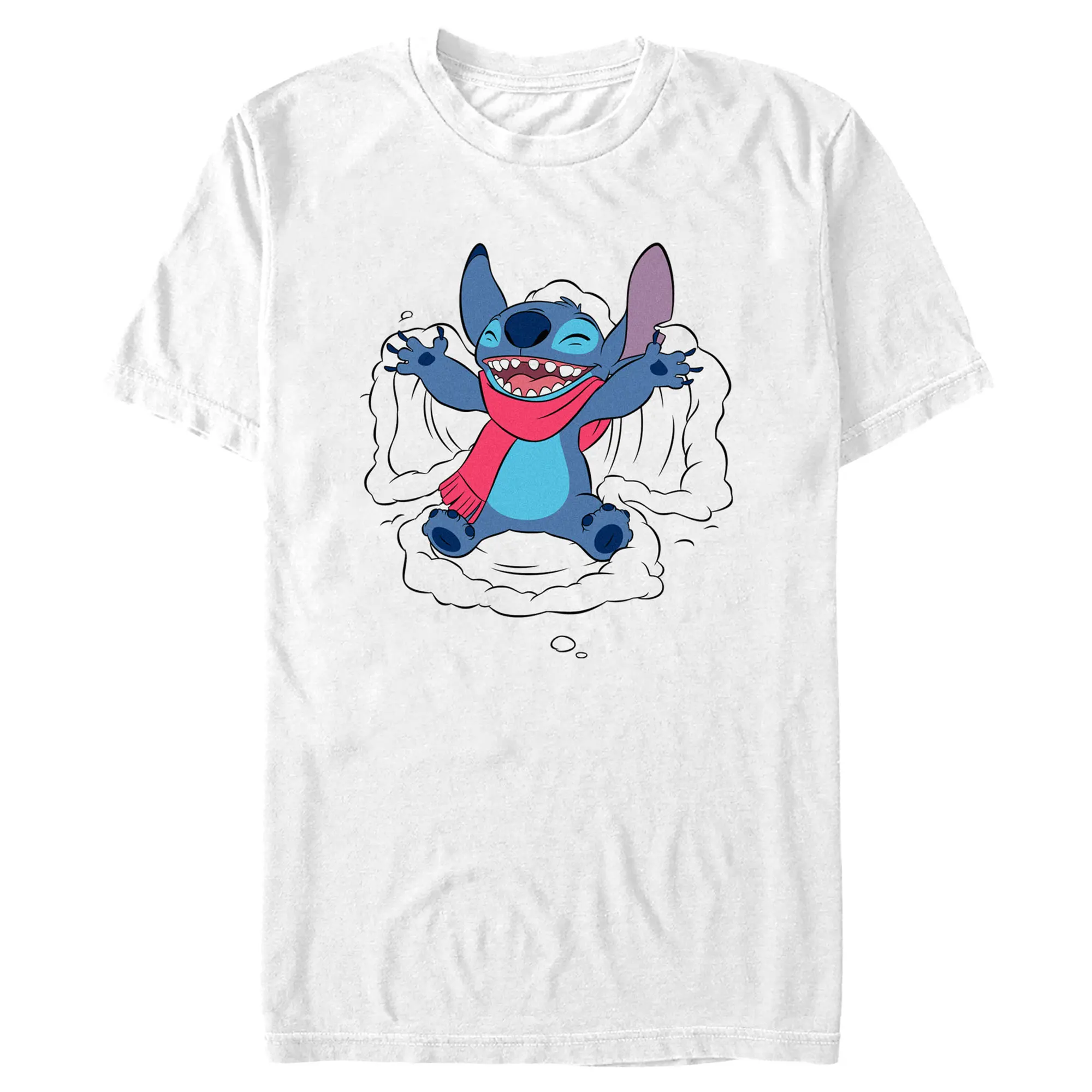 Strut your stuff with this stylish new Christmas men's t-shirt that is perfect for the holiday season! Featuring Stitch wearing a scarf while happily making a snow angel on a winter day across the front.