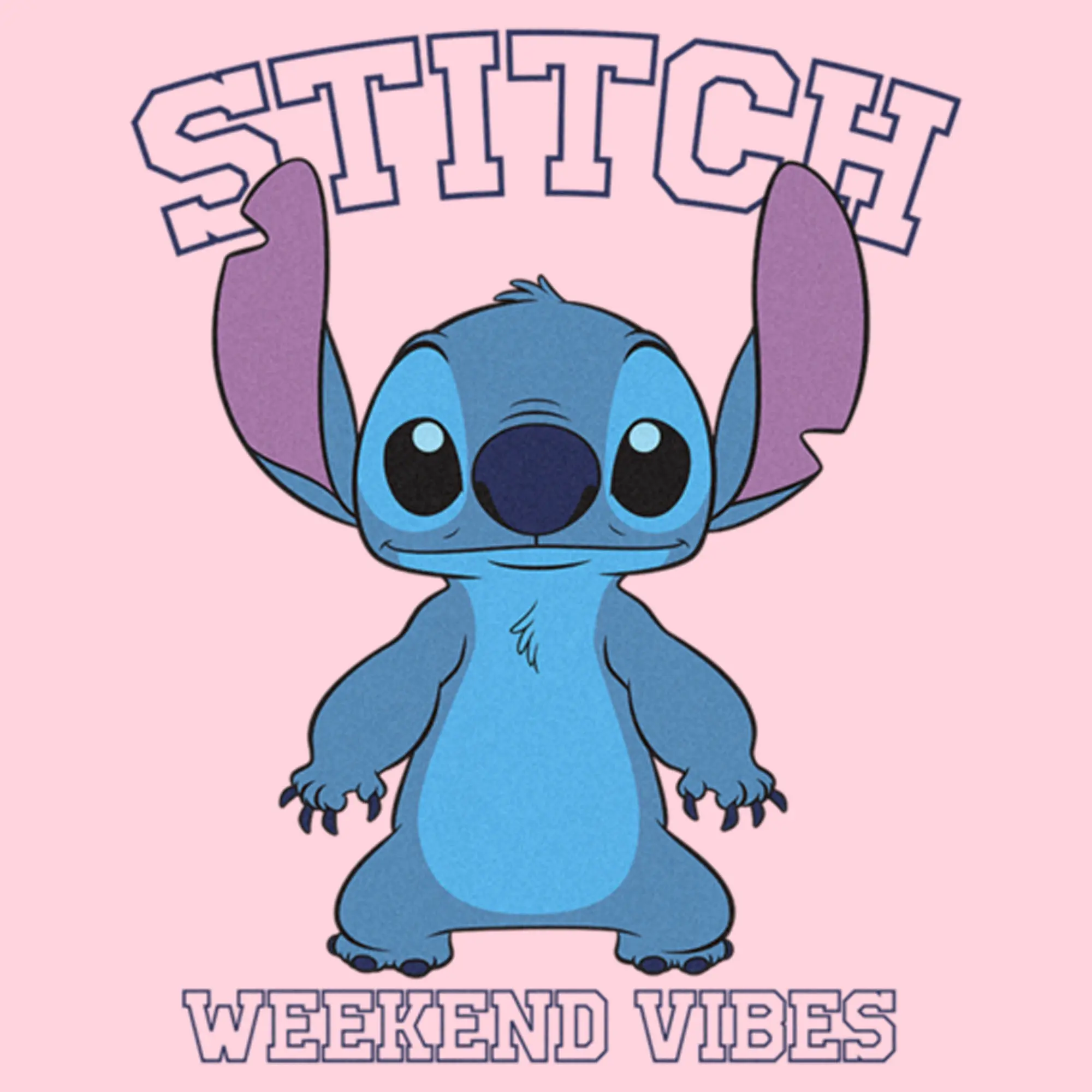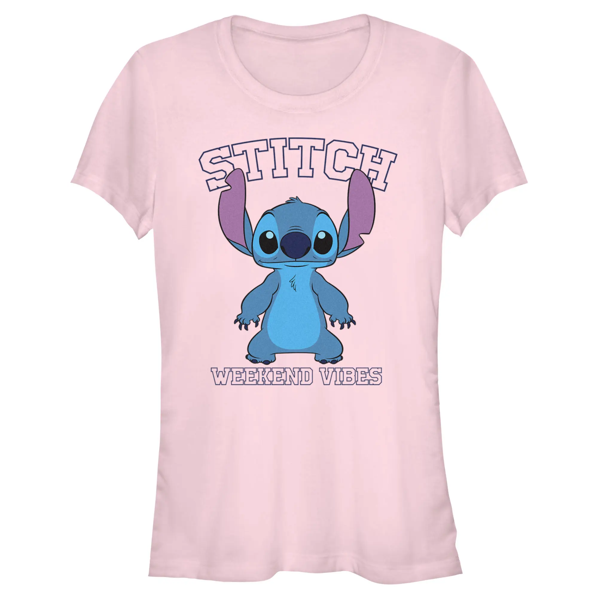Ohana means family, and family means no tee gets left behind! Find the perfect style with this officially licensed Juniors' Disney Lilo & Stitch Collegiate Weekend Vibes Graphic T-Shirt! This fun design features Stitch standing cutely across the front with the phrase: "Stitch Weekend Vibes" printed in varsity font all around him. Celebrate a certain alien, otherwise known as Experiment 626 in style this year with new hilarious apparel from the movie!