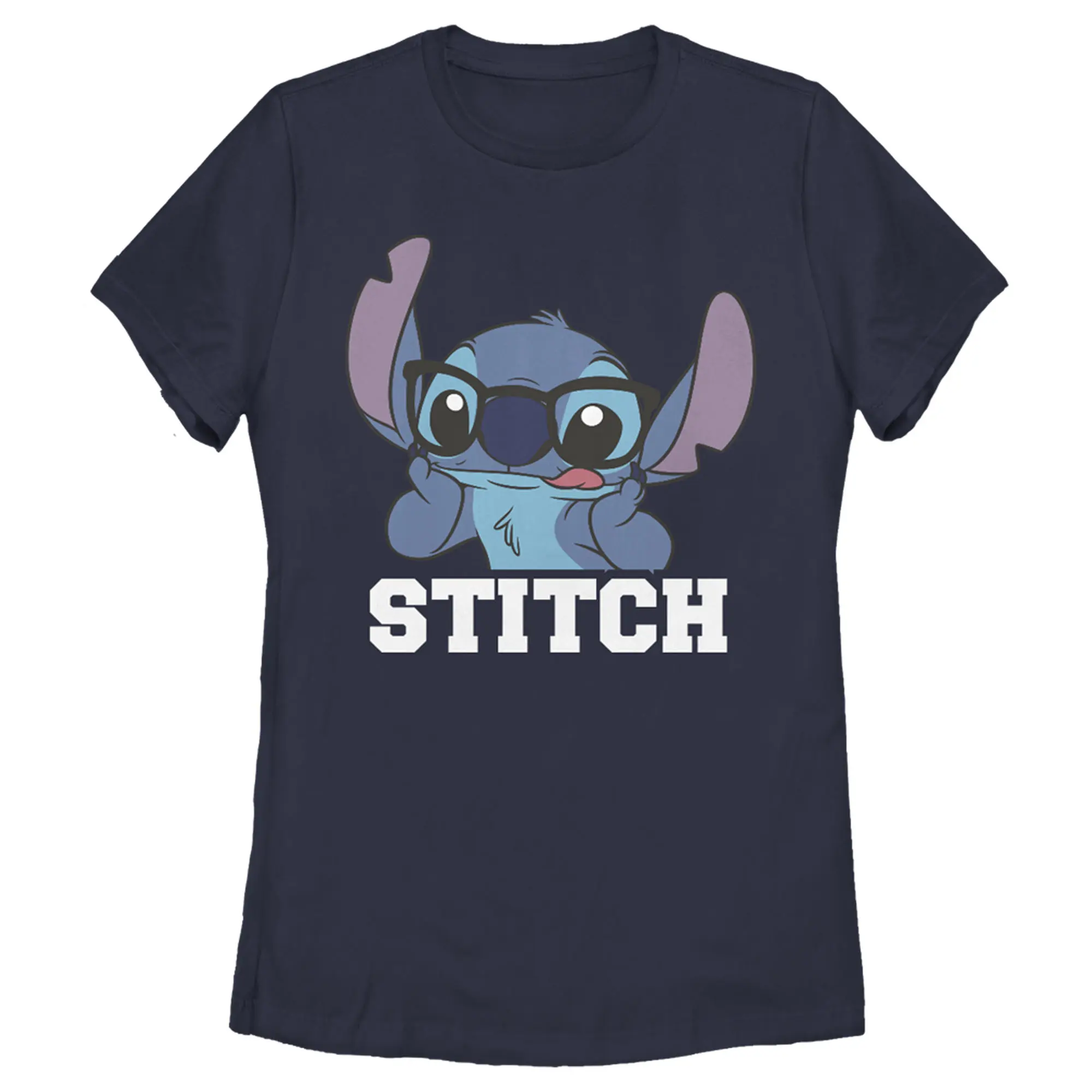 Ohana means family, and that means no tee gets left behind with this officially licensed Disney Lilo & Stitch Silly Black Glasses Women's Tee! This adorable design features Stitch smiling with his tongue out and wearing big black glasses. Your popularity will skyrocket once you wear this new graphic tee, so grab one for yourself today!