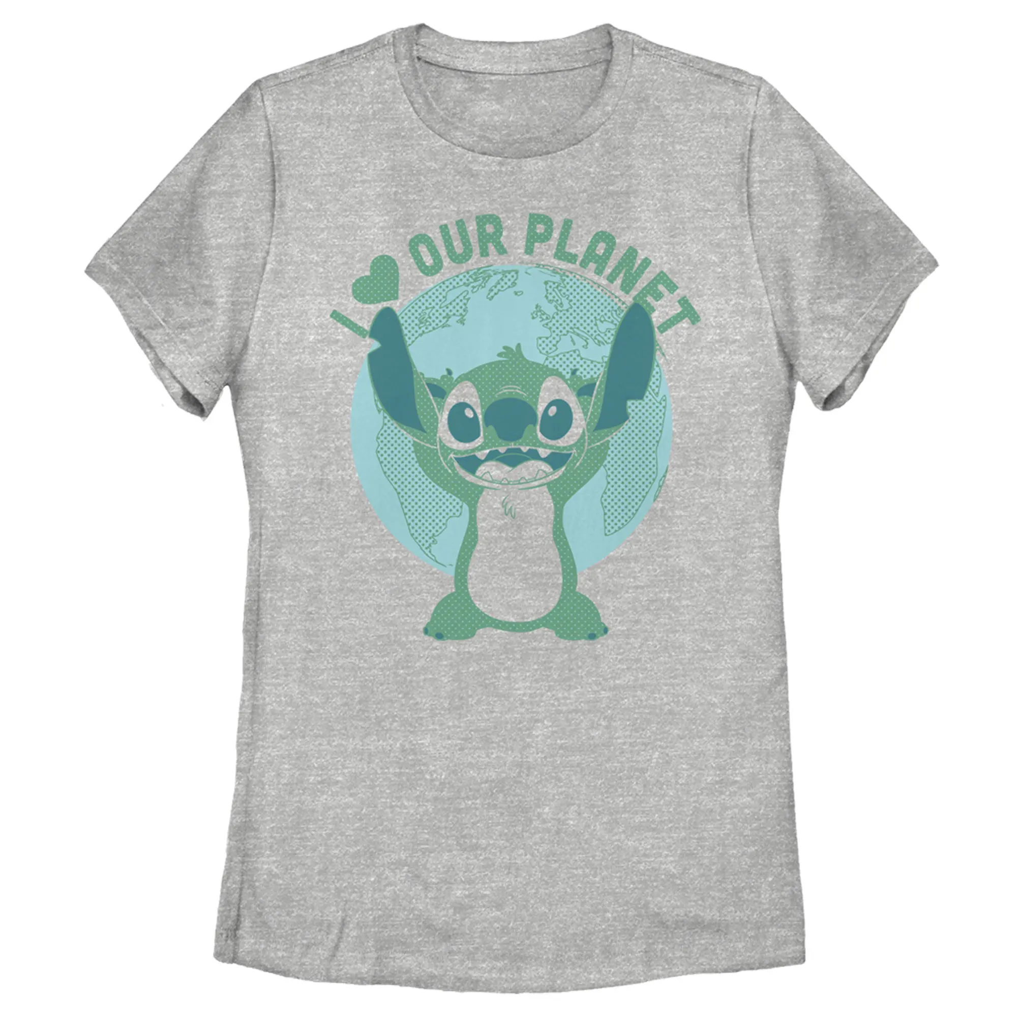 Strut your stuff with this stylish new Earth Day women's t-shirt that is perfect for heading out into the wilderness! Featuring the planet Earth in the background and Stitch with the phrase "I love our Planet" printed above in green.