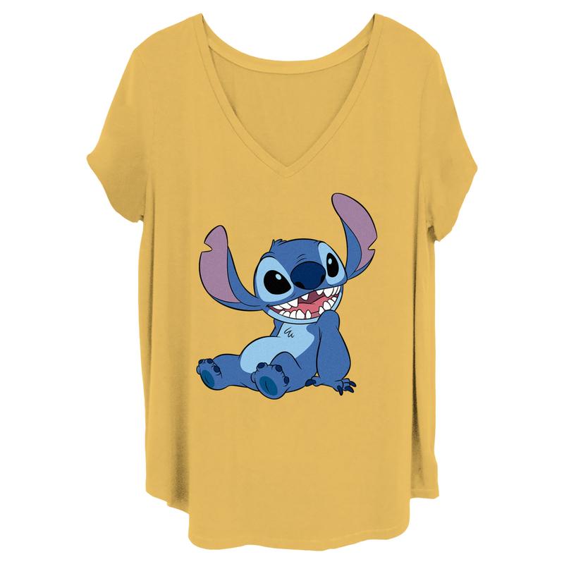 Strut your stuff with this stylish new juniors' V-neck plus size t-shirt that is perfect for every occasion! Featuring a large graphic of Stitch with ears perked up and sitting in a relaxed position across the front.