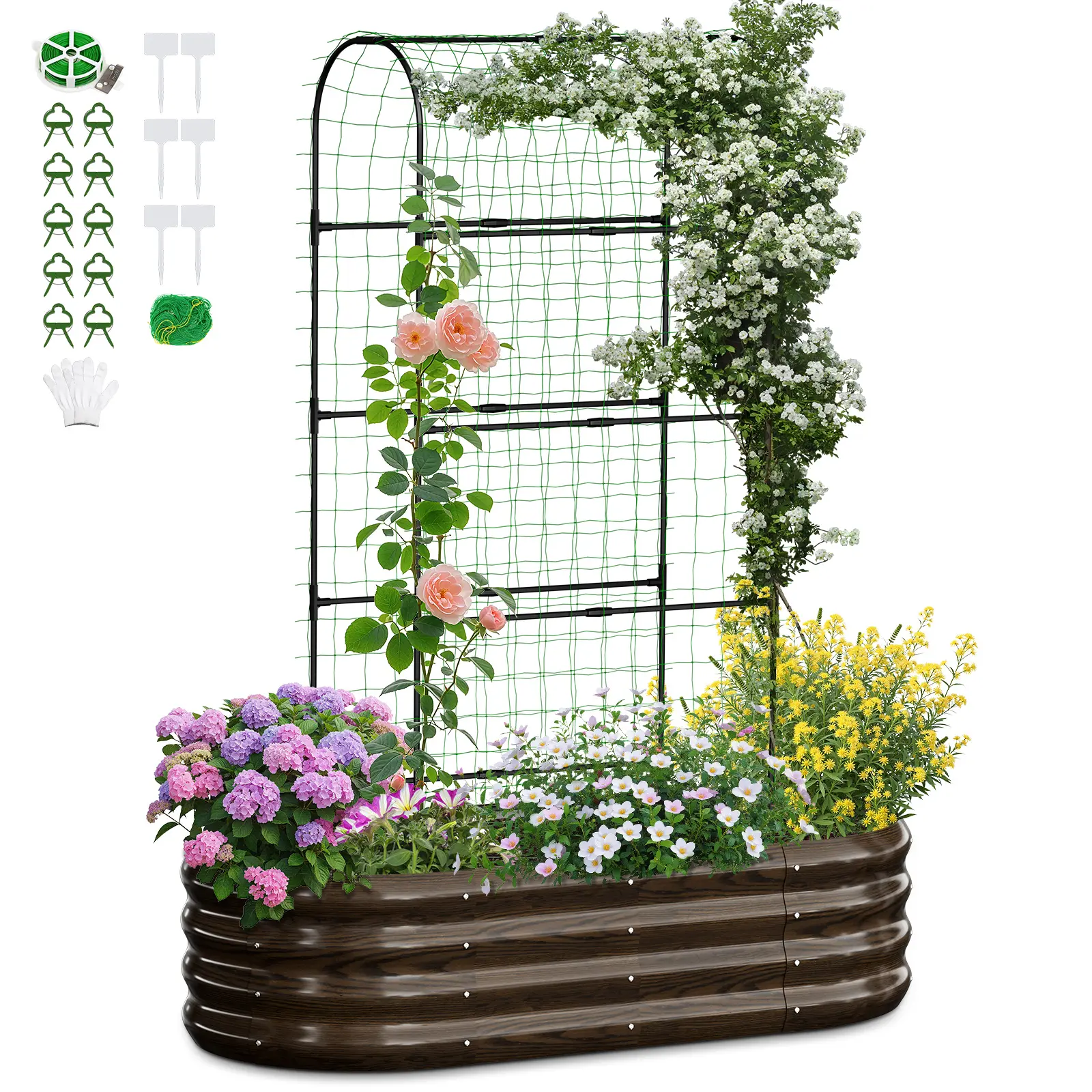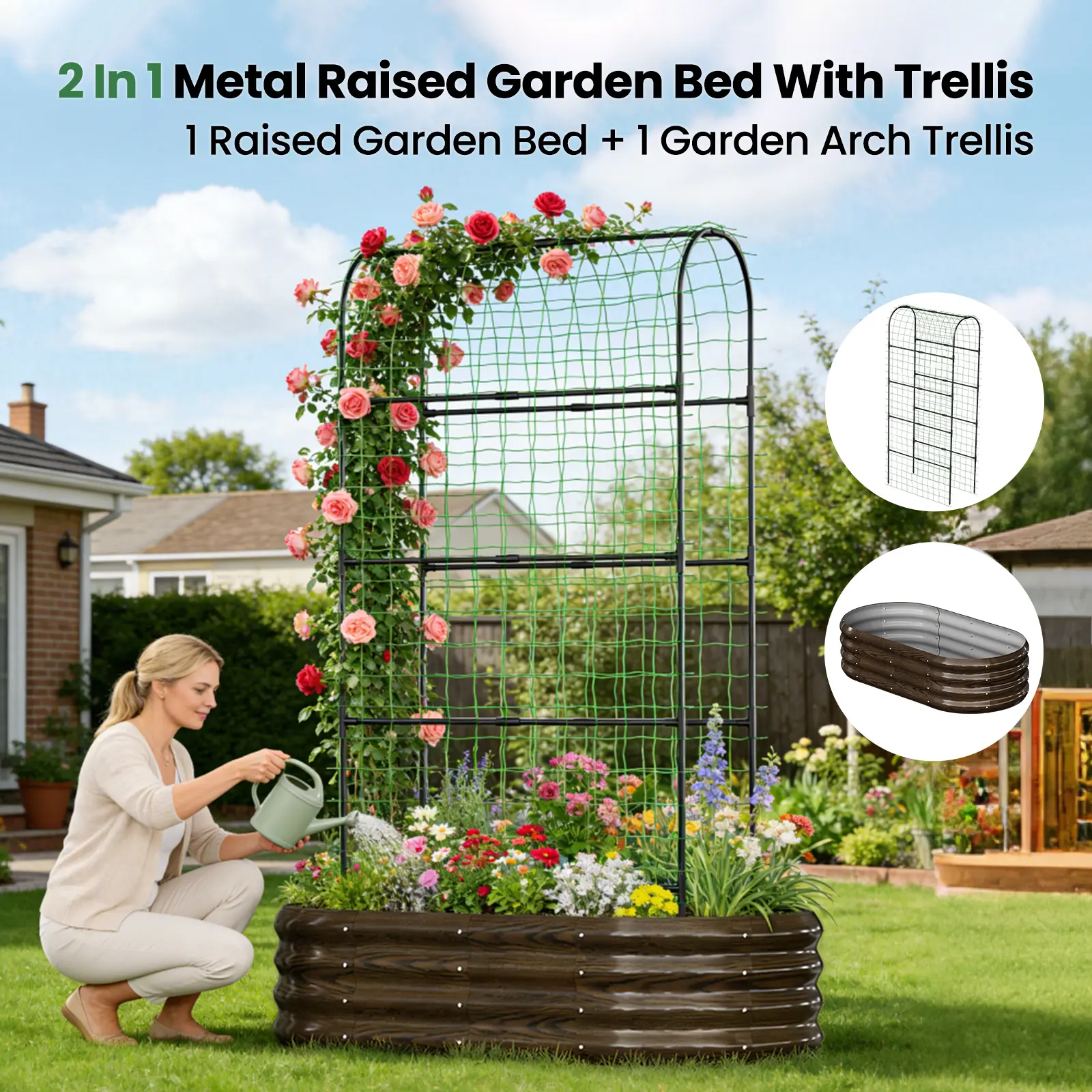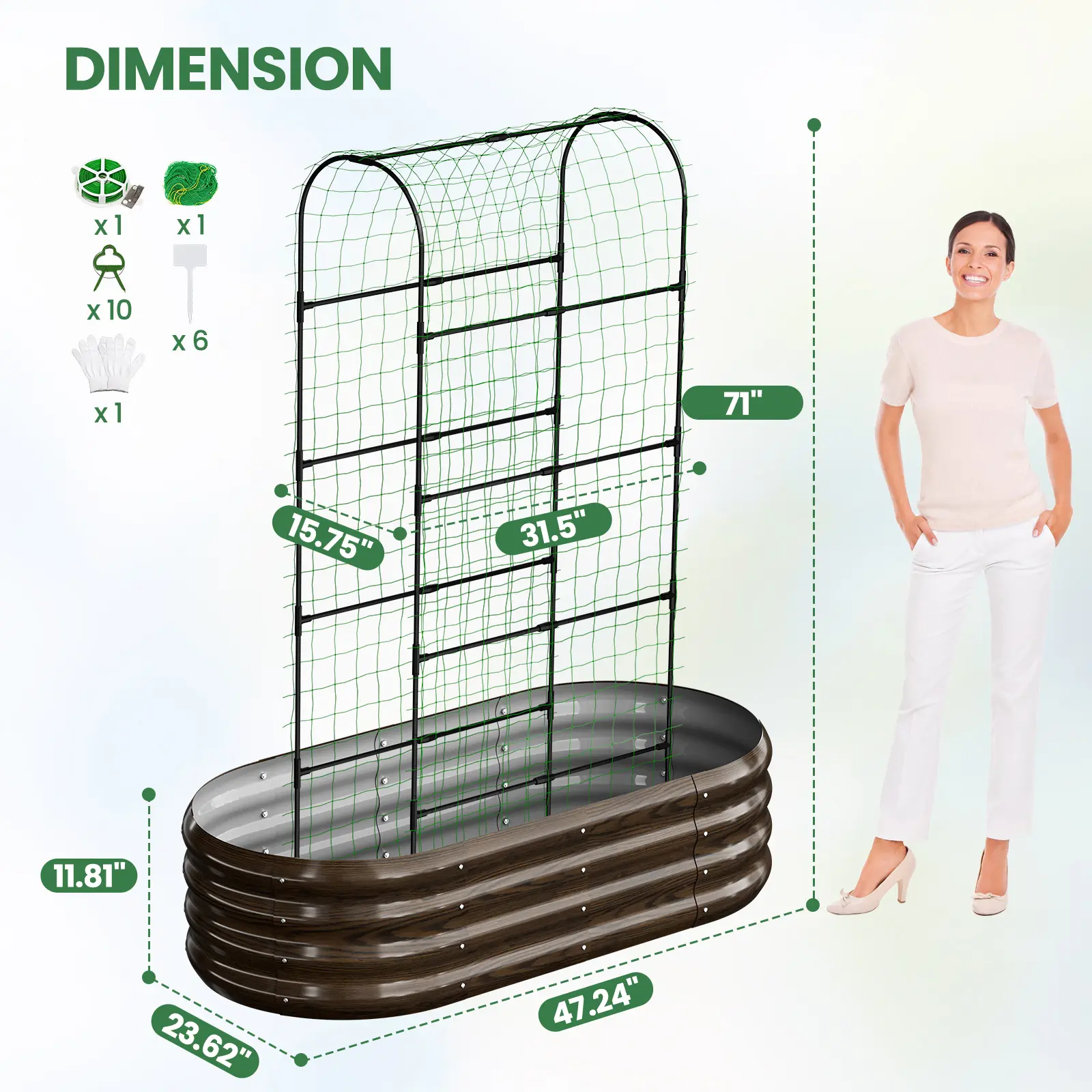 Raised Garden Bed with Trellis:This raised garden bed kit includes 1 galvanized raised bed, a 71-inch tall arch trellis, and a climbing net, providing strong support for climbing plants while enhancing the visual appeal of your backyard or garden.