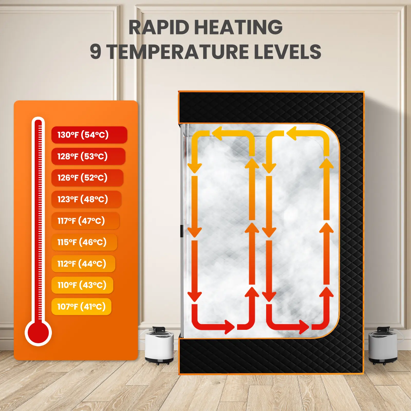 ·360° Rapid Heating: 3L/2.6L high-power steam generators for full-body warmth in minutes. 9 adjustable temperature levels and up to 90 minutes of working time.