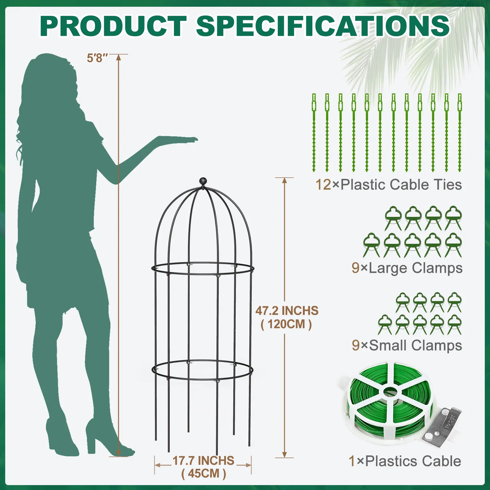 【PREMIUM QUALITY】: Our set includes 4 styles of metal garden trellises: Leaf design (3-pack, 59" x 16"), Cage design (3-pack, sizes 31.5" x 15.7" and 47.2" x 17.7"), Grid design (4-pack, 60" x 16"), and Pattern design (4-pack, 60" x 16"). Made from high-quality iron with a rust-resistant powder-coated finish, these trellises are built to last and withstand harsh weather conditions, offering both durability and style for your garden.