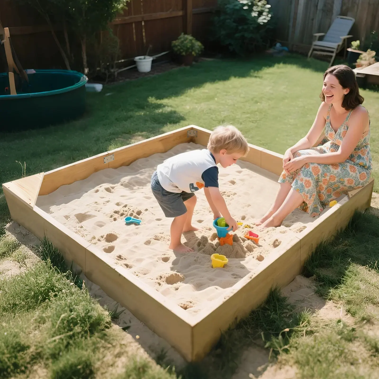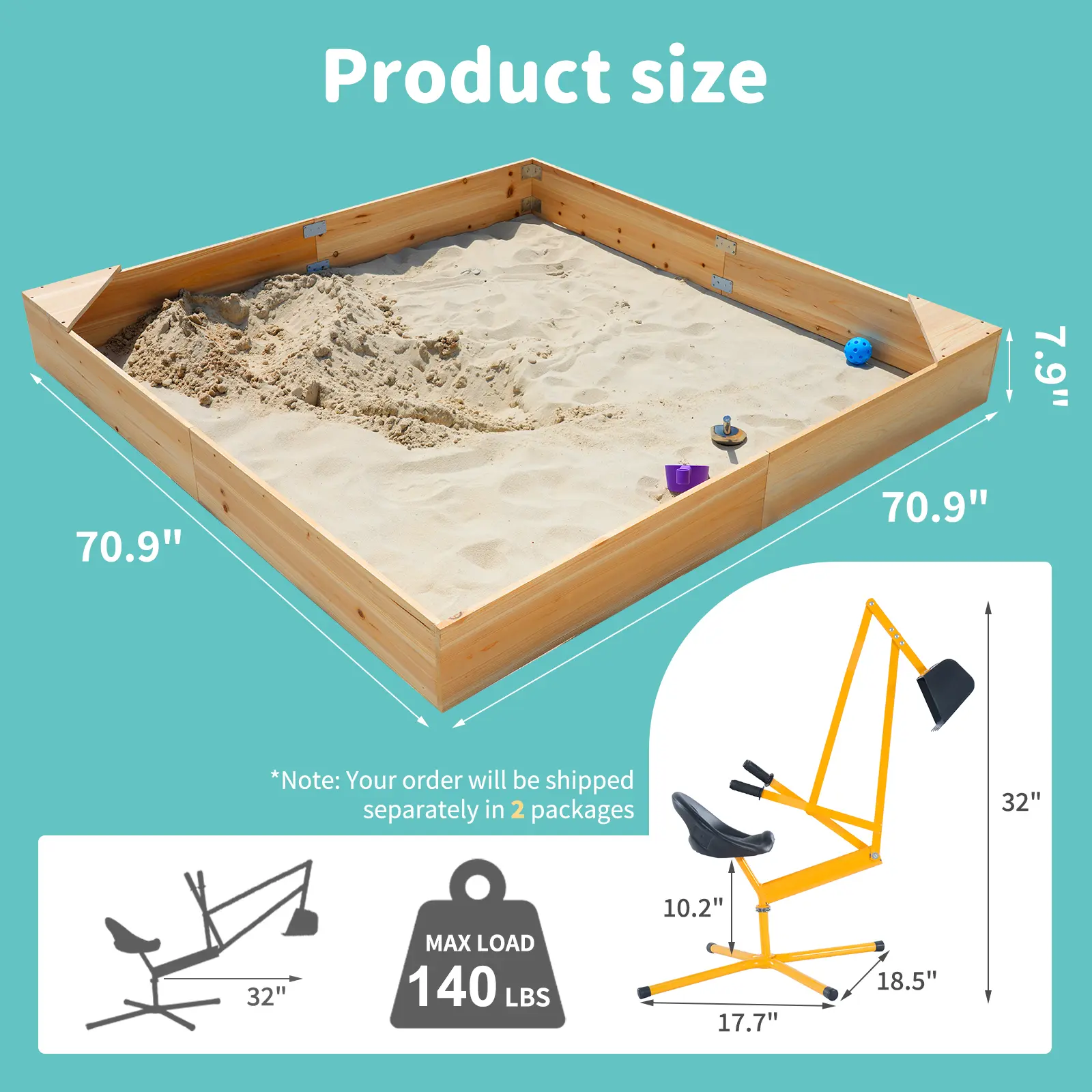 【Spacious & Safe Play Zone】A large 70.9"L x 70.9"W x 7.9"H square sandbox offers ample room for 2-10-year-olds to dig, build, and explore together. The untreated natural fir wood is splinter-free, non-toxic, and built to withstand years of outdoor adventures. Two built-in resting seats let kids pause comfortably during play.