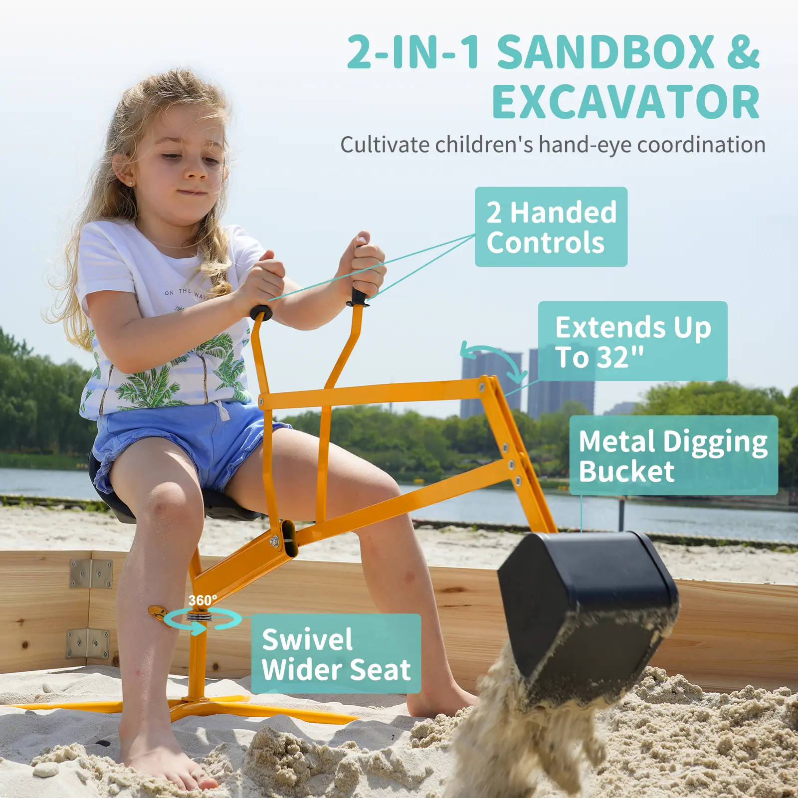 【2-in-1 Sand & Snow Excavator Fun】Includes a sturdy steel excavator with dual-hand controls for realistic role-play! The weather-resistant design works in sand, snow, or soil, encouraging year-round outdoor play. Supports up to 140 lbs with a secure, ergonomic seat for safe digging and dumping.