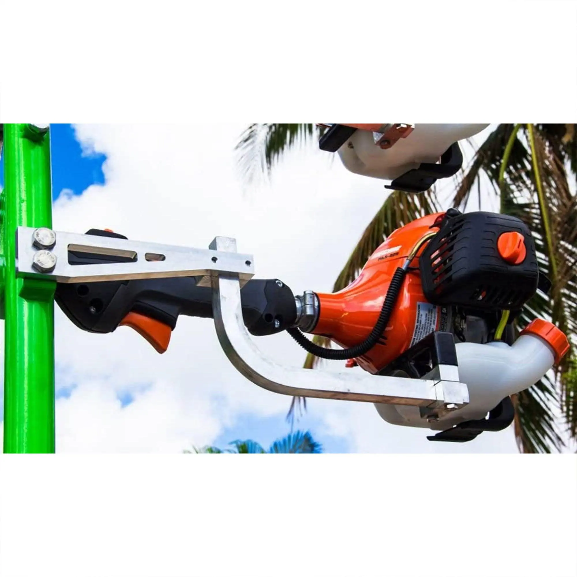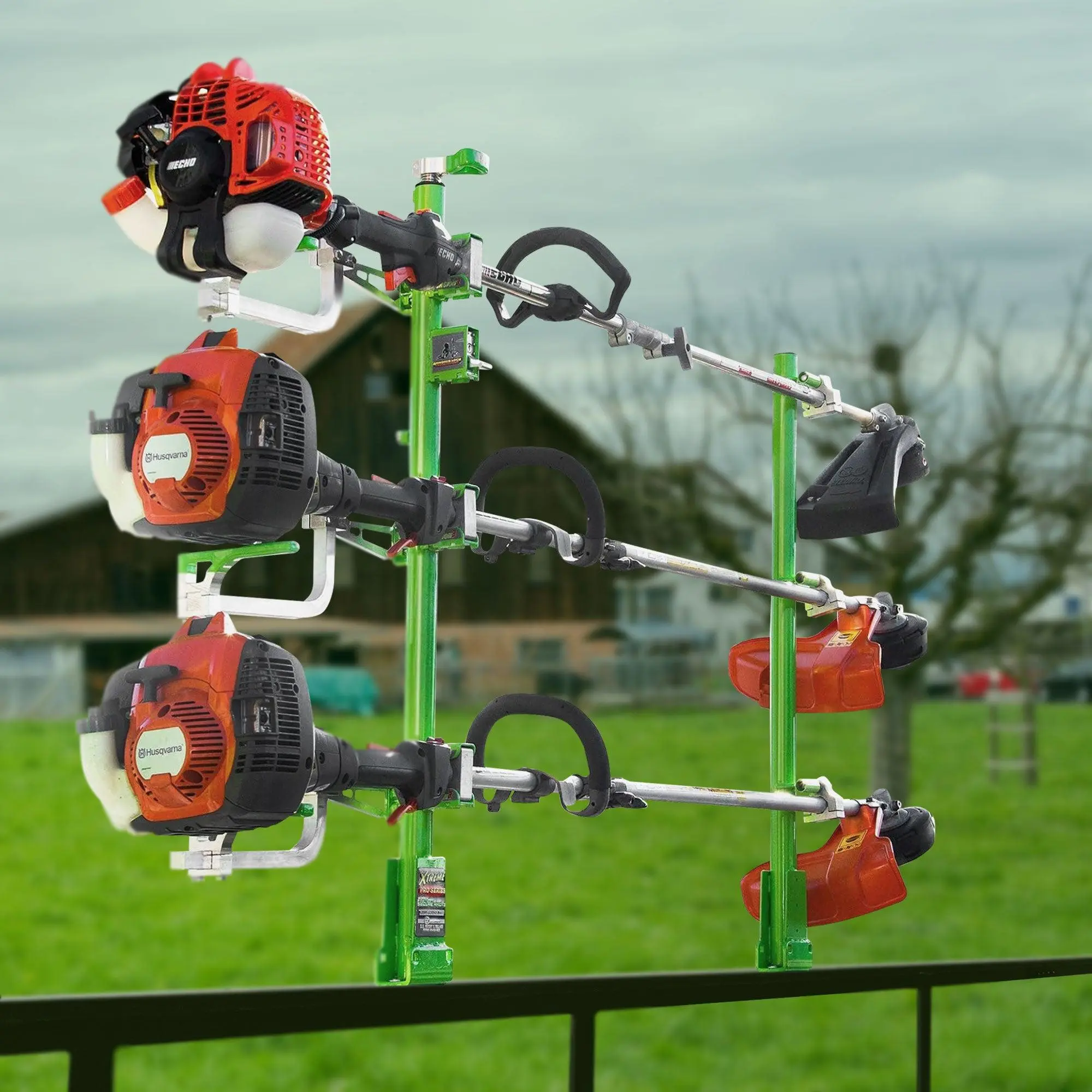 After a hard day's work trimming your garden or field, you'll want somewhere to store your line trimmers. Cut down those concerns and beef up your security with Green Touch Industries Xtreme Pro Series 3 Position Maximum Security One Lock System Line Trimmer Rack with Aluminum Mounting Blocks.This Green Touch trimmer rack comes with 3 holders that secure your line trimmers in place and protect them from miscellaneous dangers. Equipped with an automated spring-loaded 1-lock system, this rack is easy to lock up in a single simultaneous motion. This rack's high-security key-based padlock is sure to deter property theft. The tightly concealed holder keeping your landscaping equipment safely attached makes fuel spills, engine flooding, and leakage a thing of the past. The rack itself won't wear down from outdoor elements, given a powder-coated finish that prevents fading, and a similarly strong plastic-coated handle. This model includes aluminum mounting blocks and associated mounting hardware for open and closed trailers, setting you up for easy assembly. Weighs 31 pounds with 40.13 inches rack height.Don't skim out on keeping your equipment safely locked up. Avoid the risk of any damage to your line trimmers with the Green Touch Industries Xtreme Pro Series 3 Position Maximum Security One Lock System Line Trimmer Rack with Aluminum Mounting Blocks.