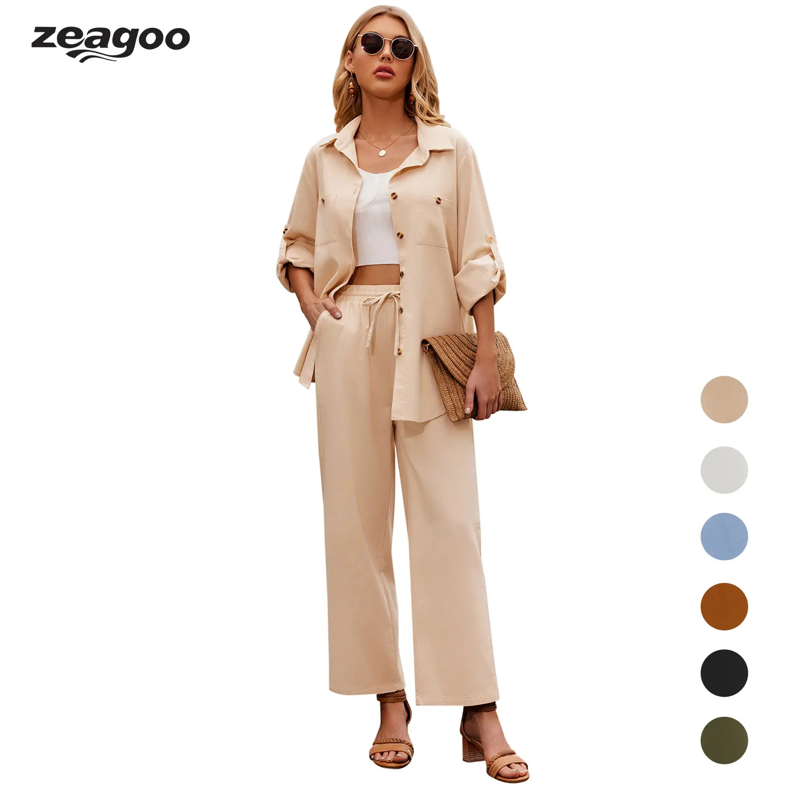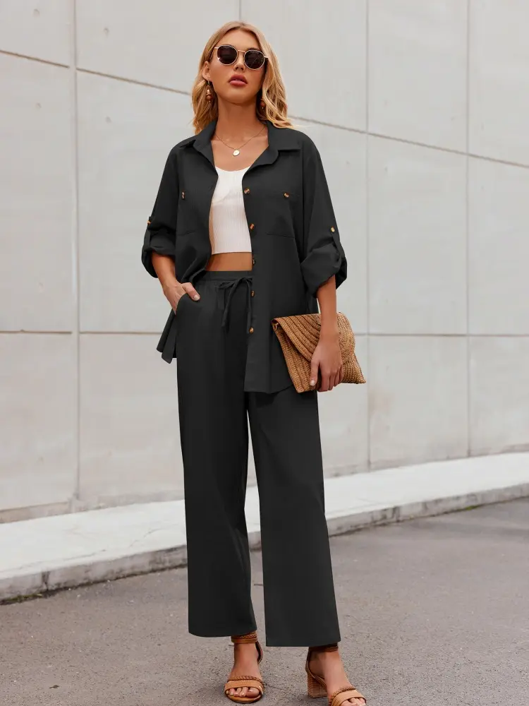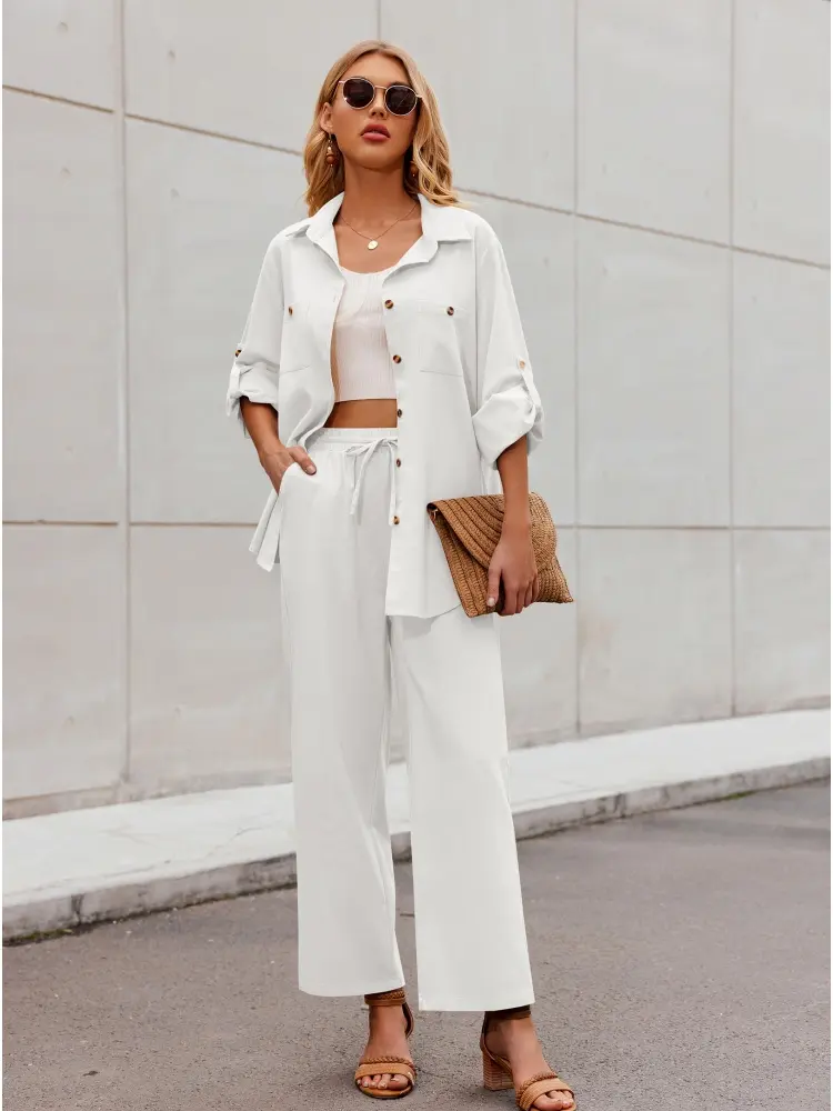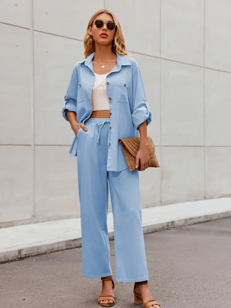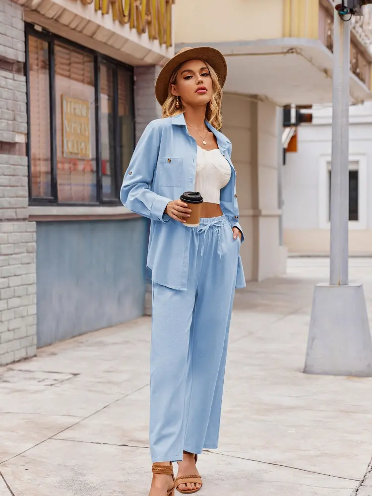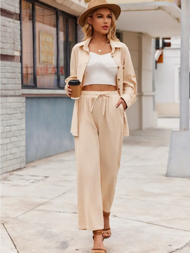 ·Versatile Outfit: Women 2 piece outfits sets can be wear separately. The long sleeve button down shirt can be pair with jeans, skirts, leggings or shorts,and the drawstring pants can also be match with T-shirt or camisole.