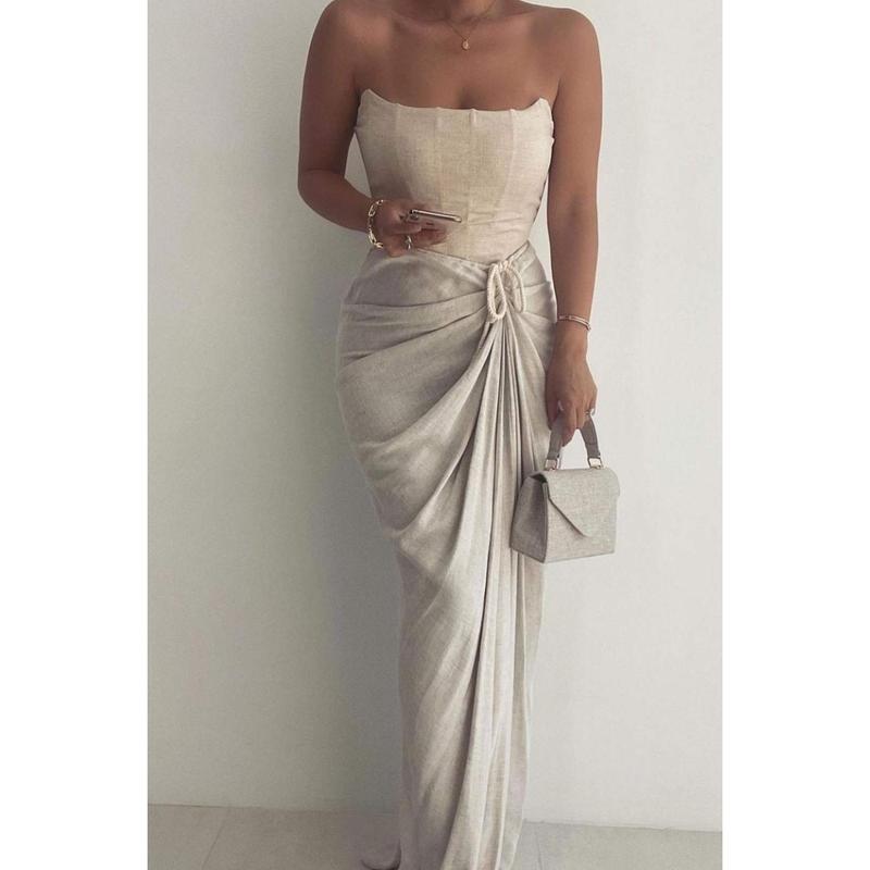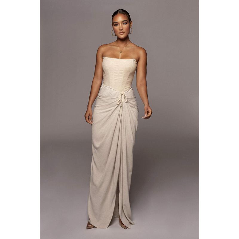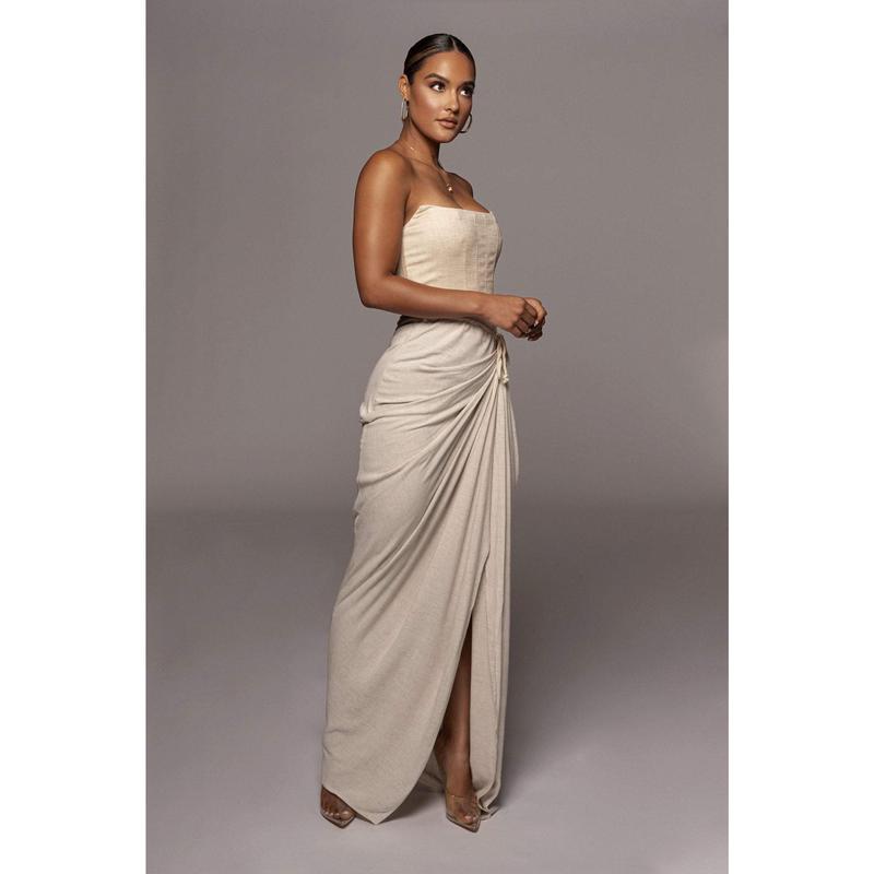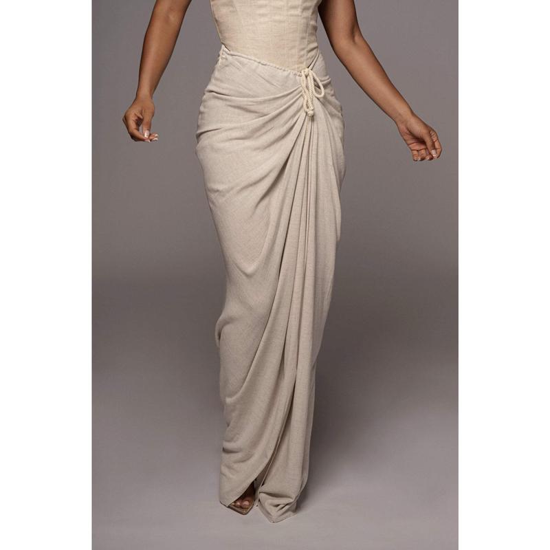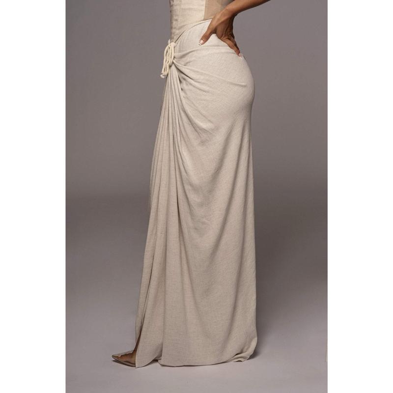 Draped to perfection proving life's better in linen with our Natural Noelia Linen Slit Skirt. Crafted in a fresh linen material, this maxi skirt features a drape design with a stylish rope drawstring and a slit on the side. Hidden side zipper for closure. Pair with our FENIX LINEN CORSET for a full look. No stretch. Single lined.