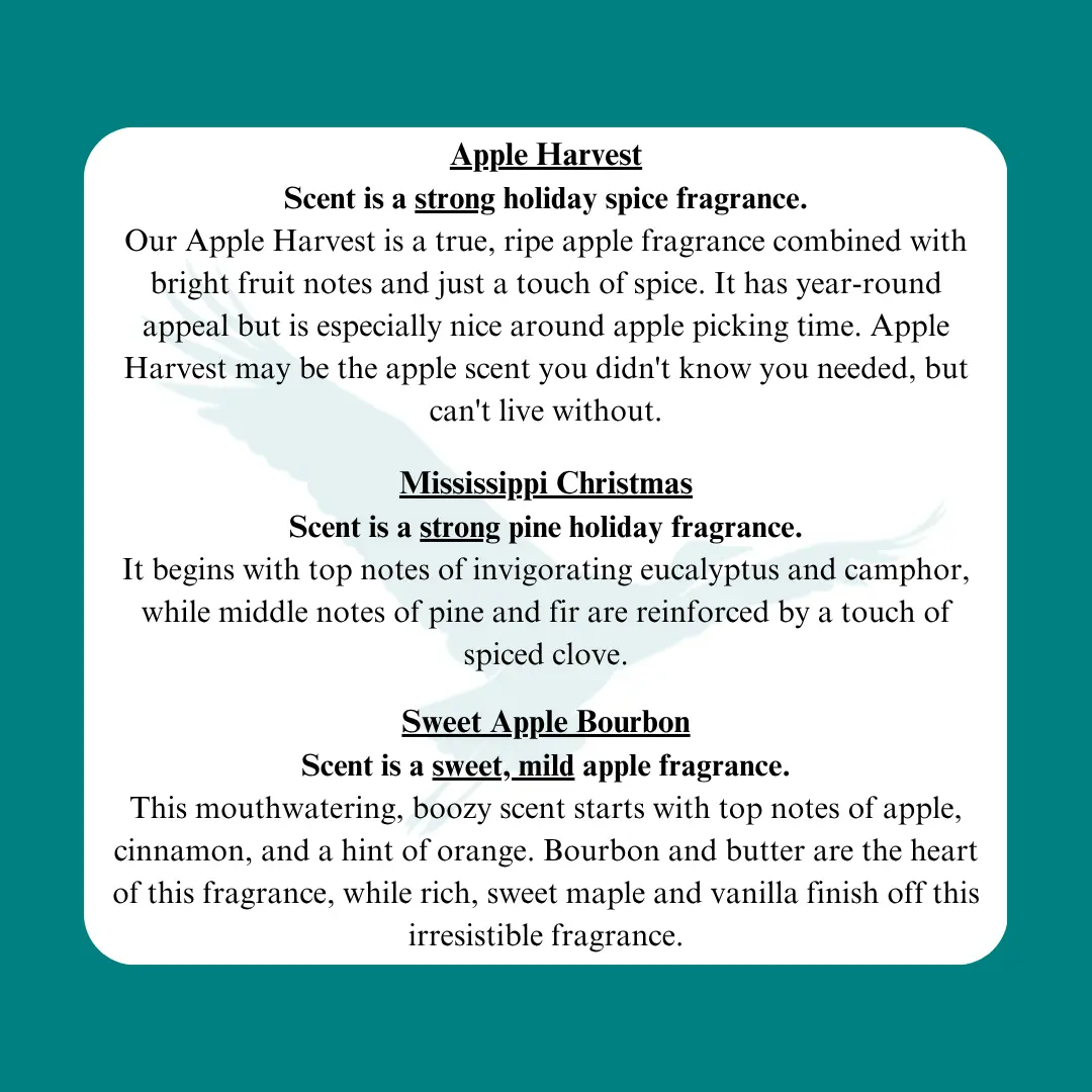 Amazing light and fresh smell! Makes the entire house smell amazing!!! It has its own spit on the fireplace for easy access to it!
