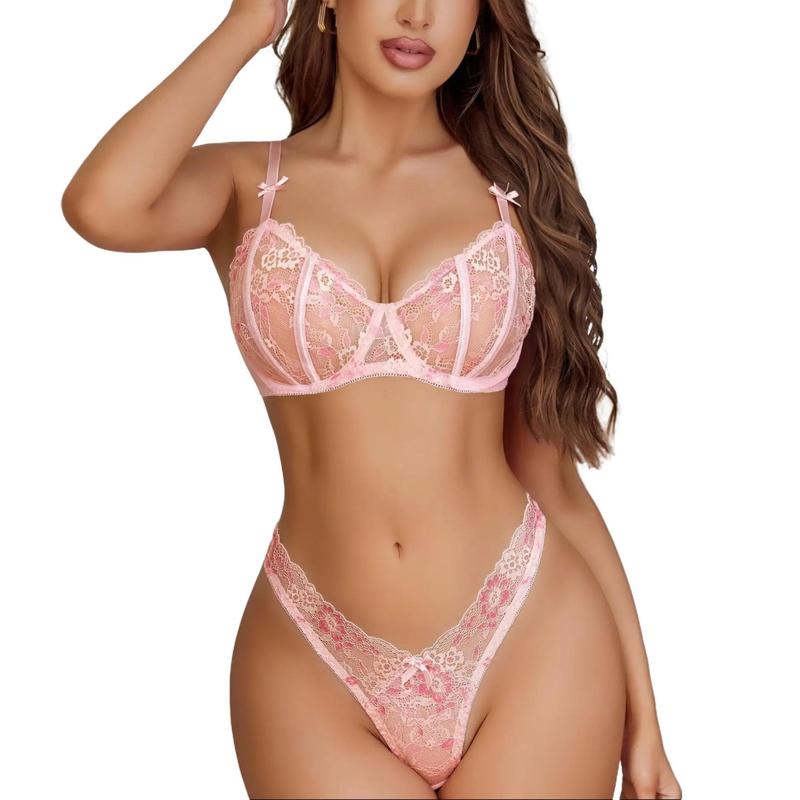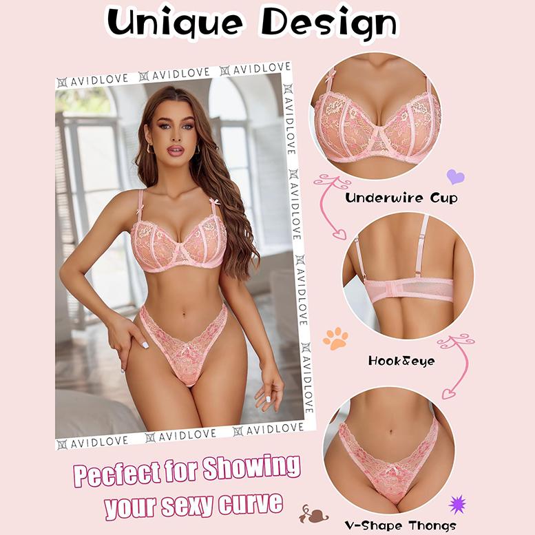 Ā·Design of the Top:The Lace Bra features with underwire dedicated lace cups that can offer high support and a flattering fit. The adjustable spaghetti straps and the hook&eye buckles can make people adjust freely, allow for a perfect fit.Satin Bow decor on the front make this lingerie very cute and charming.