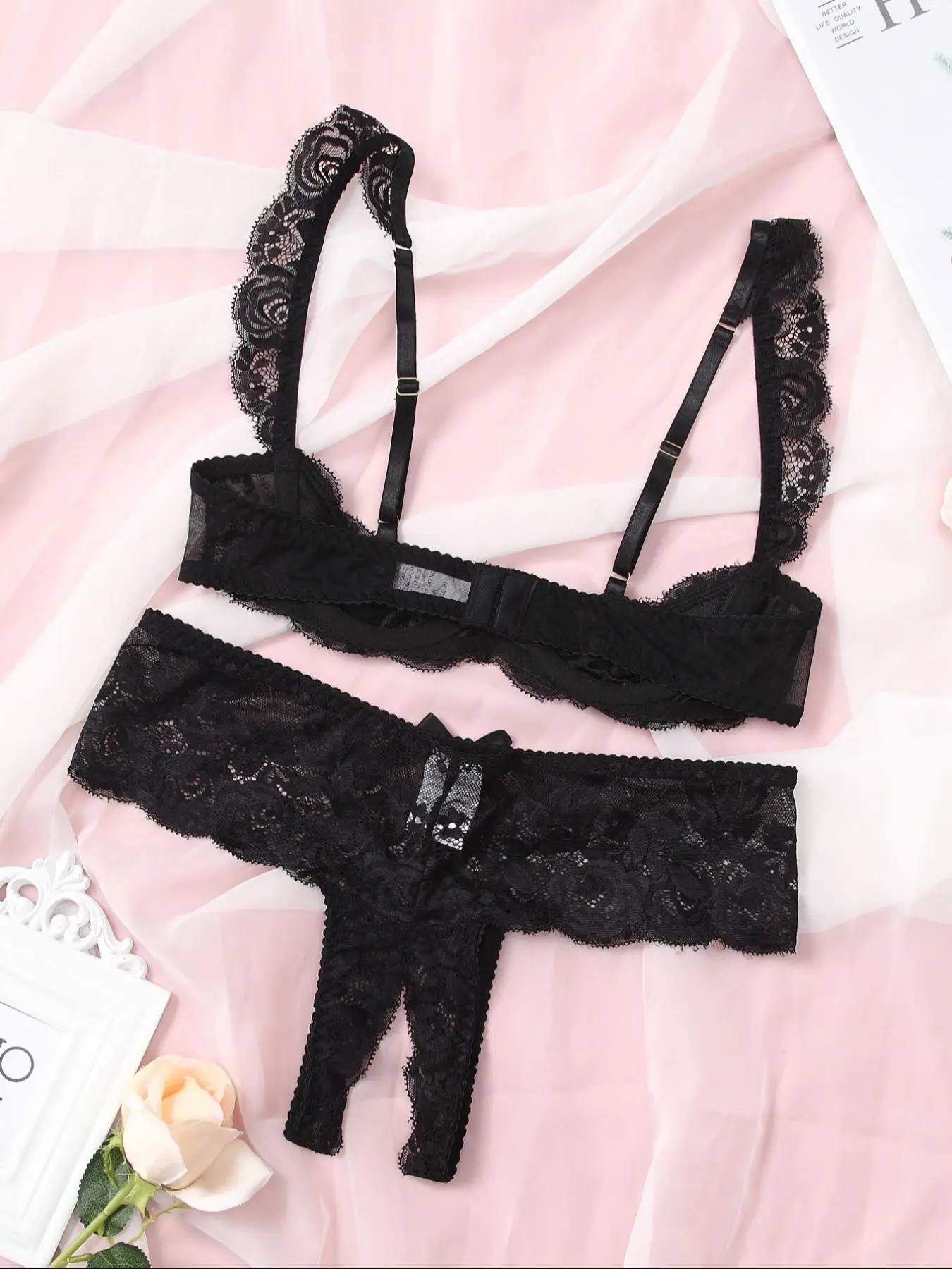 ăCrotchless Thongă: Featuring a bow-decorated crotchless thong, this set combines playful elegance with sensuality, perfect for special occasions or daily allure.