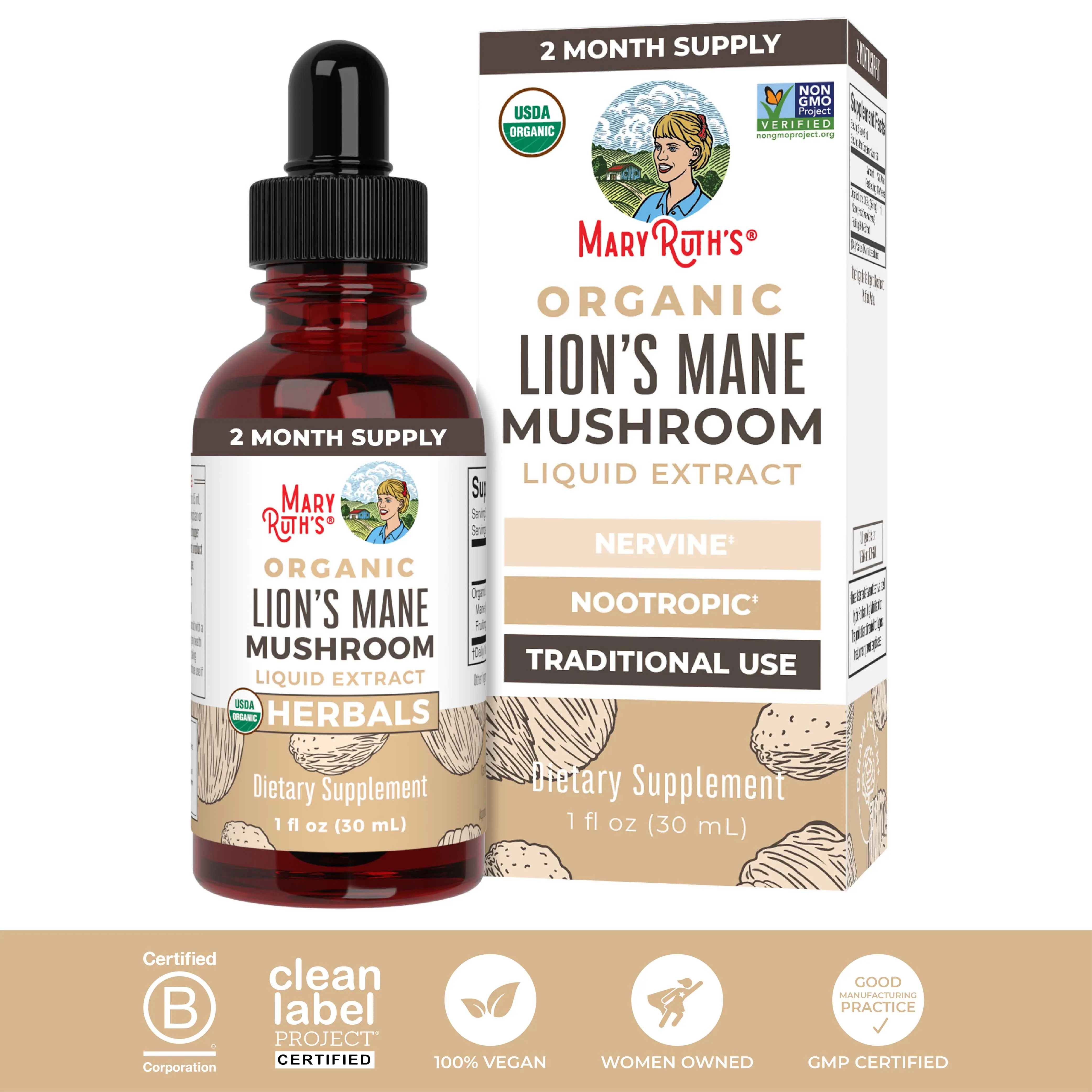 For Most Lifestyles: MaryRuth's Organic Lion Mane Mushroom Liquid Extract is USDA Organic, Non-GMO, vegan, made in a GMP facility. Dairy free, nut free, gluten free, soy free, sugar free, no synthetic or artificial colors, alcohol free tincture. B Corp Certified.