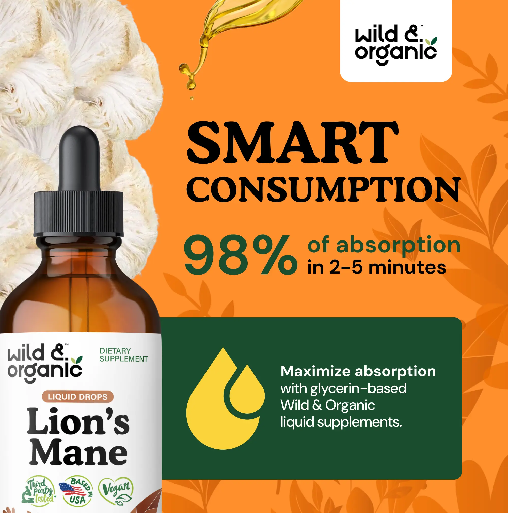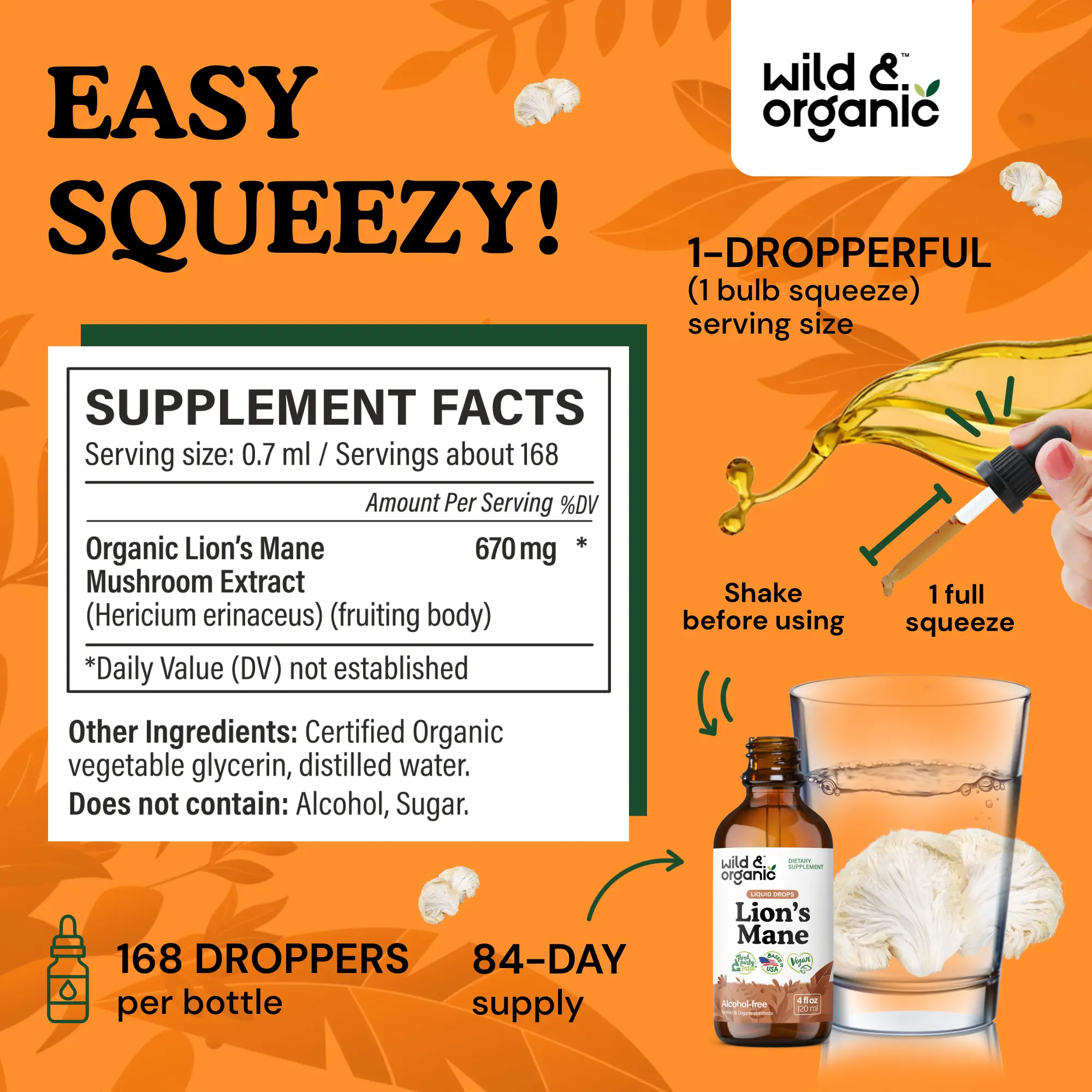 Wild & Organic's Lion's Mane Liquid Drops - Brain & Focus Support - Vegan, Sugar & Alcohol-Free Extract Tincture - Healthcare & Fitness Supplement - Natural