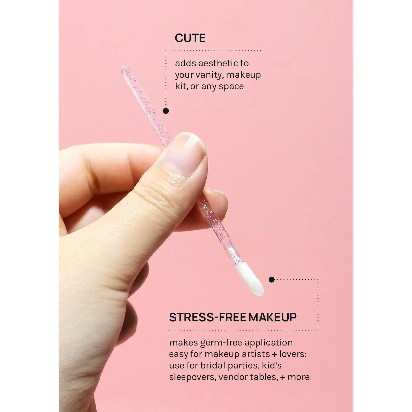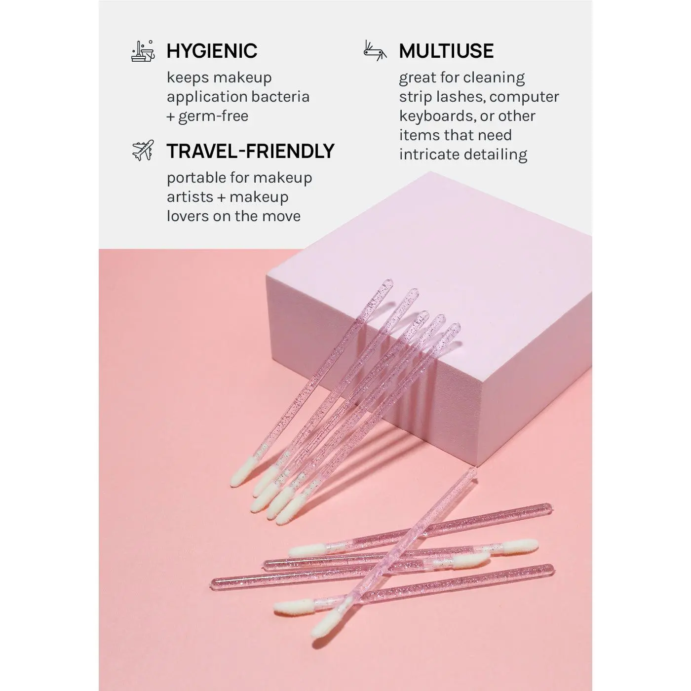 These wands are a stylish fix for hygienic makeup application during photoshoots, parties, weddings, + more. They are great for perfecting makeup, cleaning strip lashes + computer keyboards, or other items that need intricate detailing.