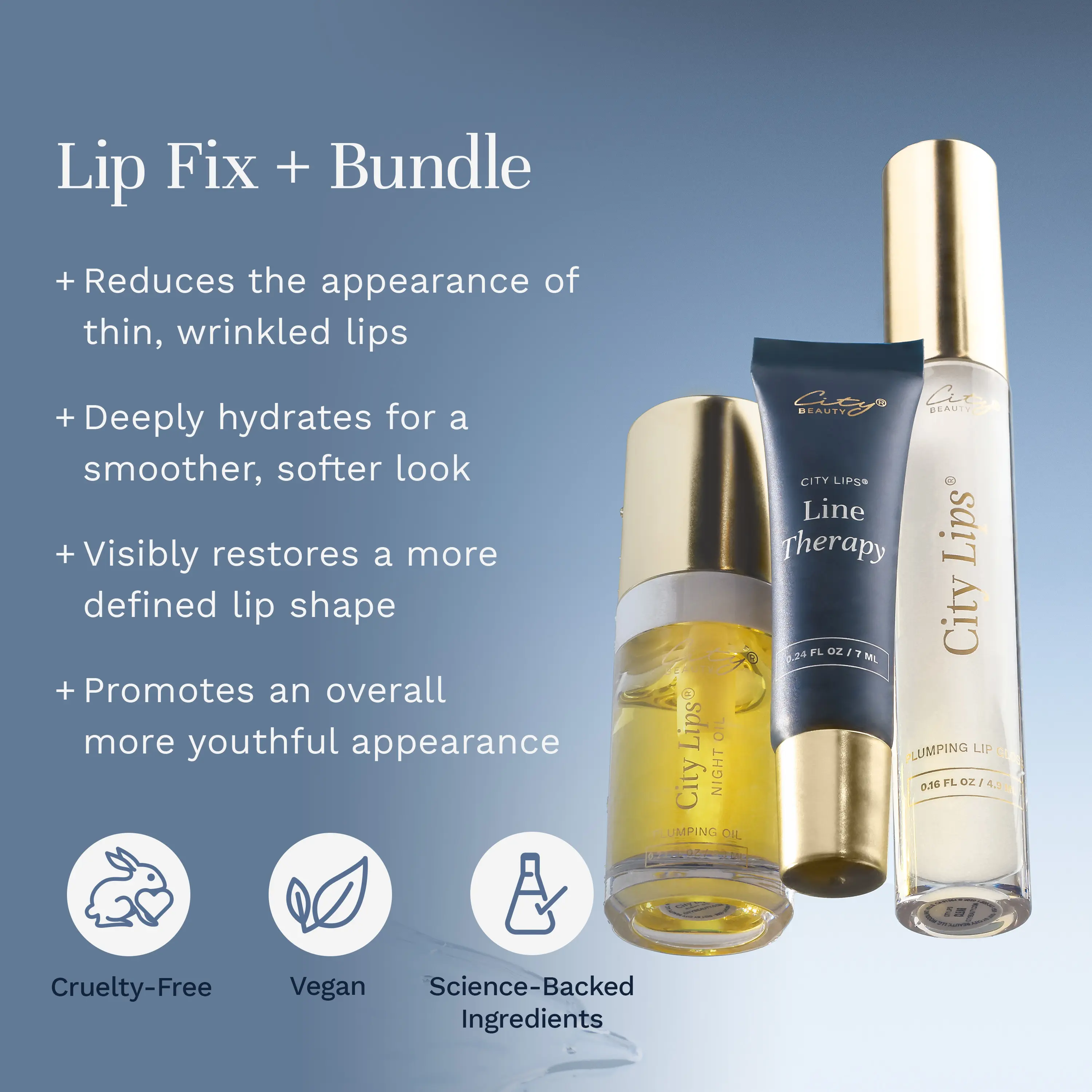 The Lip Fix bundles are a targeted lip care system designed to visibly smooth the look of lip wrinkles, plump the appearance of thinning lips, and deeply hydrate dry, aging lips. This routine helps restore the appearance of healthier, more youthful-looking lips — day and night.*