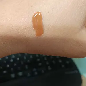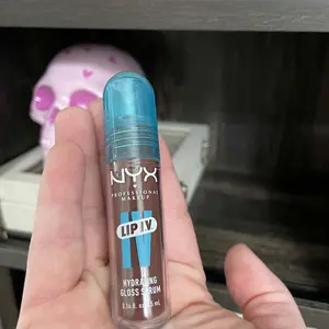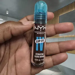 First time trying the NYX lip IV hydrating gloss serum in the shade 01 Caramel drip it's very glossy with pigment, not sticky, it has a very subtle smell to it not fruity nor perfume, will see how hydrating is on the lips, made in Korea, has a seal sticker with color tone name of the lip gloss, ty!.
