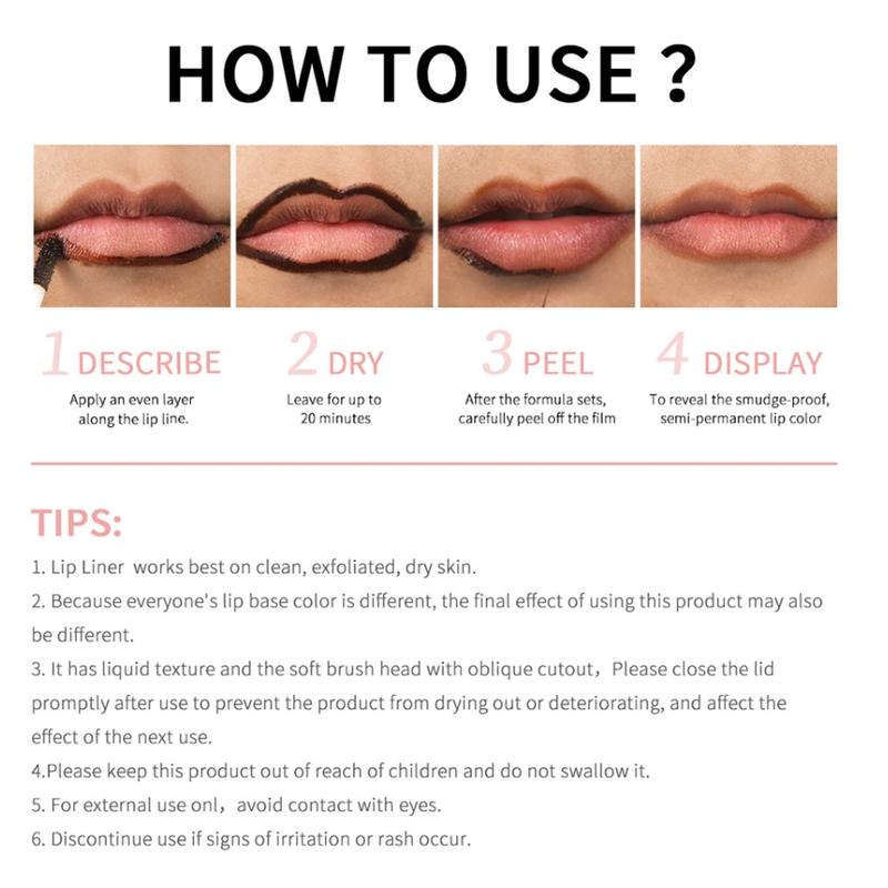 Works great and will last till you actually go in with soap and scrub it yourself. Won’t budge from eating. I like to apply my regular lipliner on top. I got shade 4. Leave it on for 20 minutes for extra pigment.