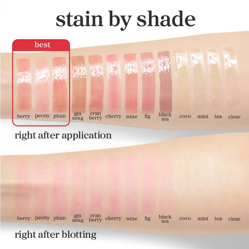 Not a fan. The "stain" color is the same as every other stain out there. Extremely pink, pinky pink, bright pink, unreal lip-color pink. The gloss itself feel like a gloss not an oil, for one, and for two, the stain is just way too bright. Fig and wine were nearly exactly the same. Disappointed.