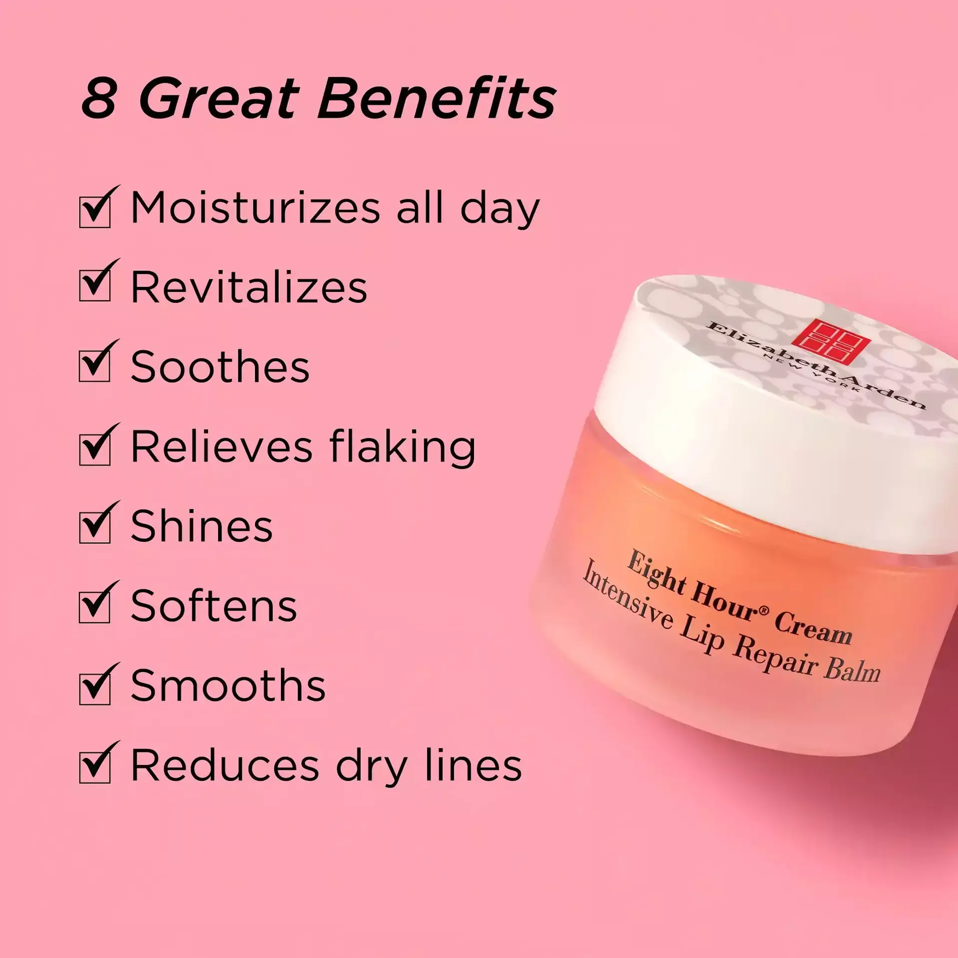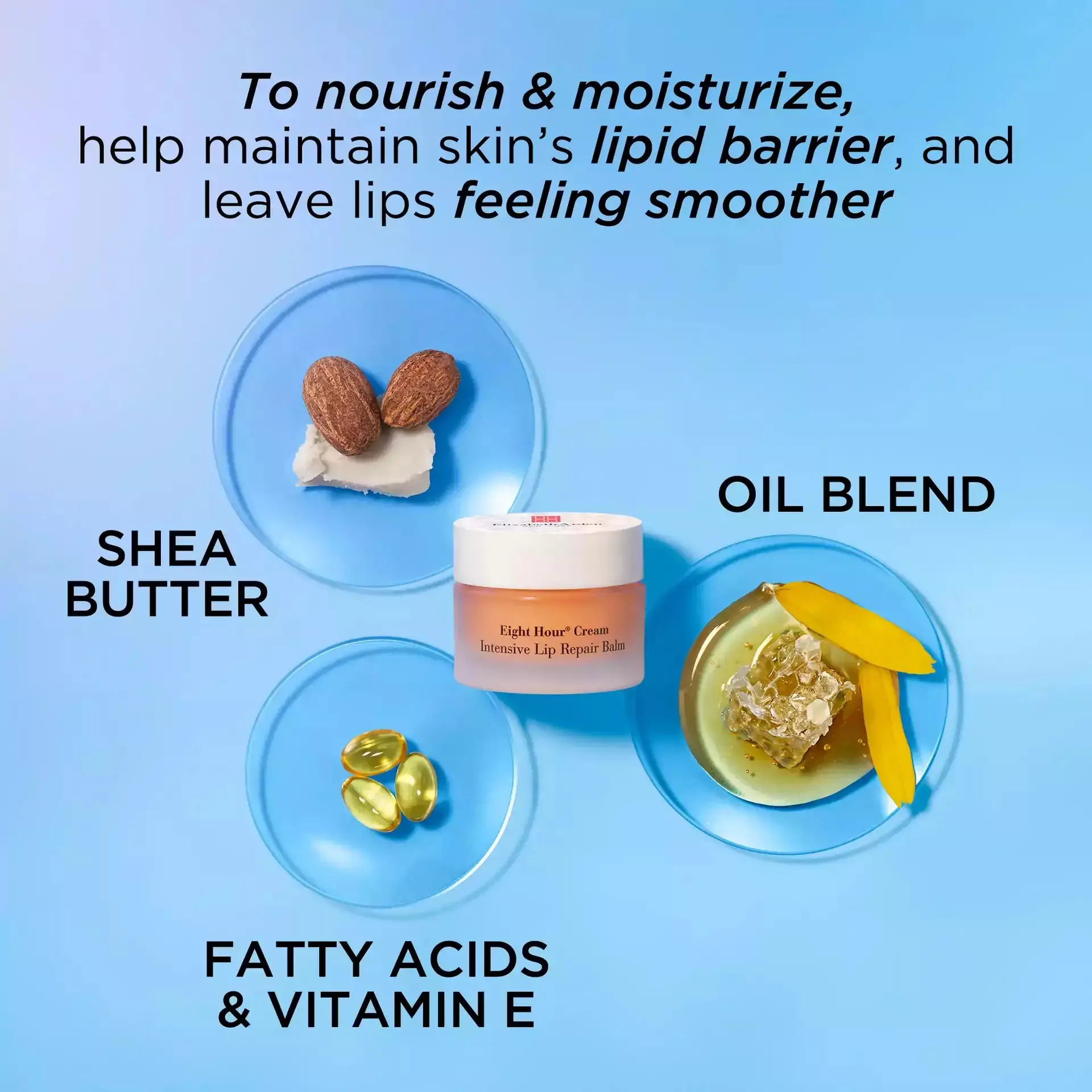 Packaged in a portable jar with a twist off lid, Eight Hour® Cream Intensive Lip Repair Balm gives your lips a subtle sheen and a refreshing eucalyptus-based fragrance.