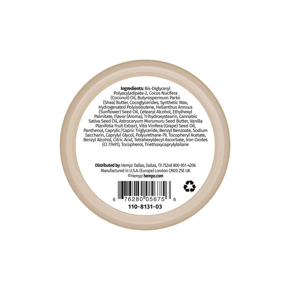 IngredientsBis-Diglyceryl Polyacyladipate-2, Cocos Nucifera (Coconut) Oil, Butyrospermum Parkii (Shea) Butter, Cocoglycerides, Synthetic Wax, Hydrogenated Polyisobutene, Helianthus Annuus (Sunflower) Seed Oil, Cetearyl Alcohol, Ethylhexyl Palmitate, Flavor (Aroma), Trihydroxystearin, Cannabis Sativa Seed Oil, Astrocaryum Murumuru Seed Butter, Vanilla Planifolia Fruit Extract, Vitis Vinifera (Grape) Seed Oil, Panthenol, Caprylic/Capric Triglyceride, Benzyl Benzoate, Sodium Saccharin, Caprylyl Glycol, Polyurethane-79, Tocopheryl Acetate, Benzyl Alcohol, Citric Acid, Tetrahexyldecyl Ascorbate, Iron Oxides (CI 77491), Tocopherol, Triethoxycaprylylsilane