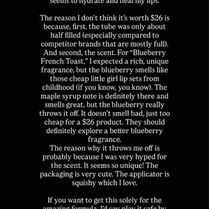 First off, amazing formula that’s why it’s a 5 star rating, BUT, for $26.52 total I don’t think it’s necessarily fair at all (for the blueberry French toast) because mine came halfway filled (same for other customers in the reviews) & I just think for a $26 lip balm, it should be filled up way more.
