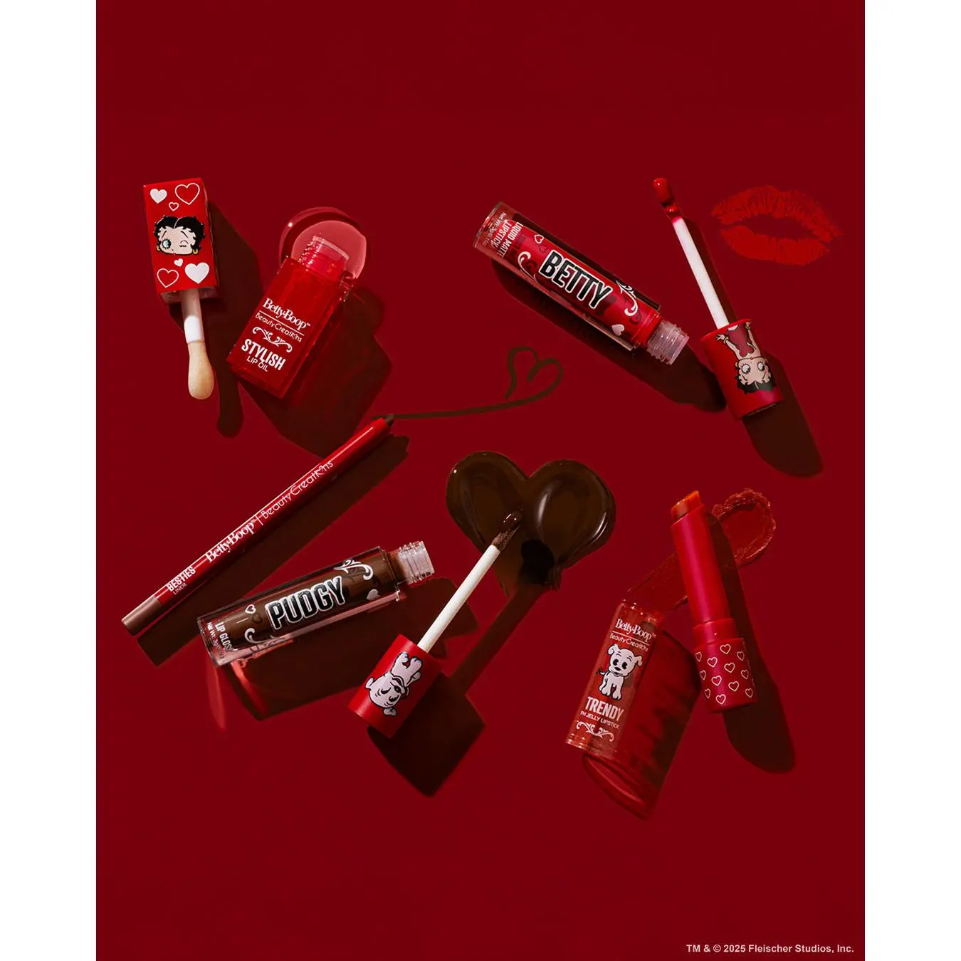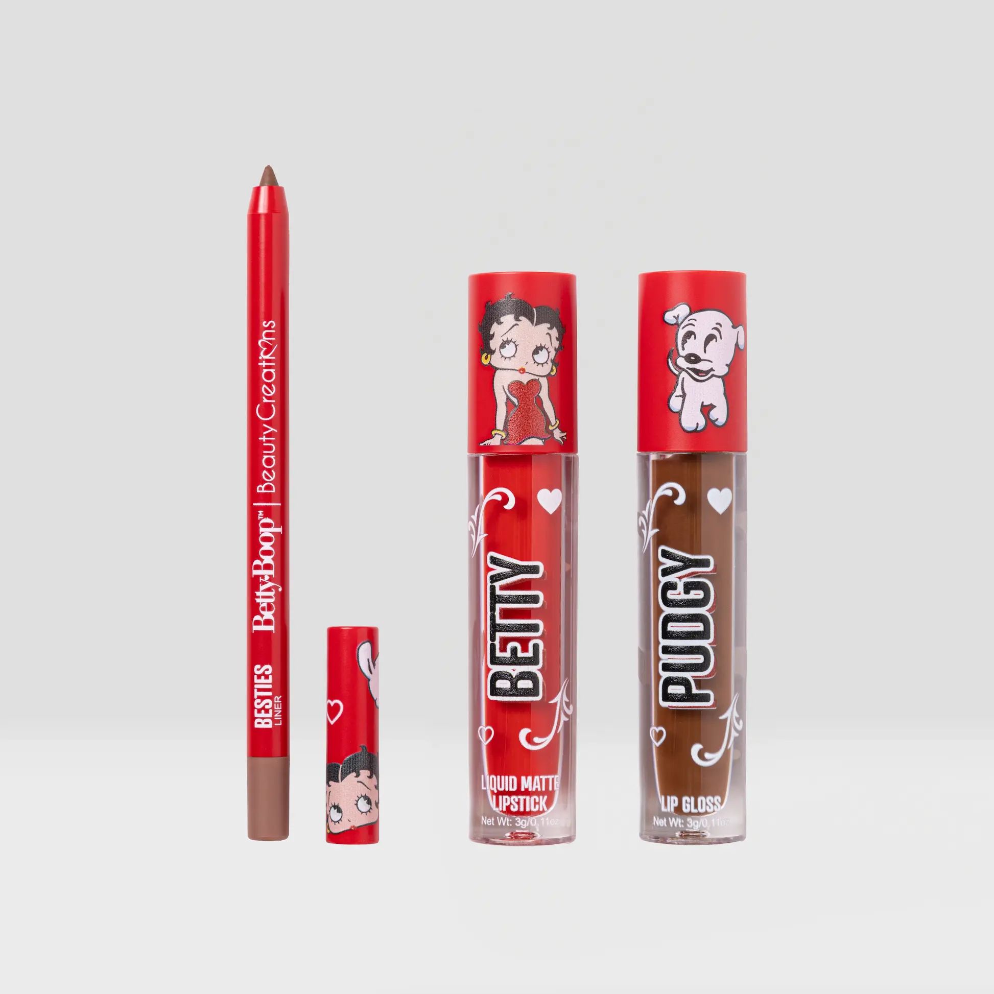 Achieve the ultimate Boop pout with the Betty Boop x Beauty Creations "Besitos" Lip Trio! This 3-piece lip kit features everything you need to define, color, and shine—giving you bold, kissable lips with a sweet cherry-scented twist.