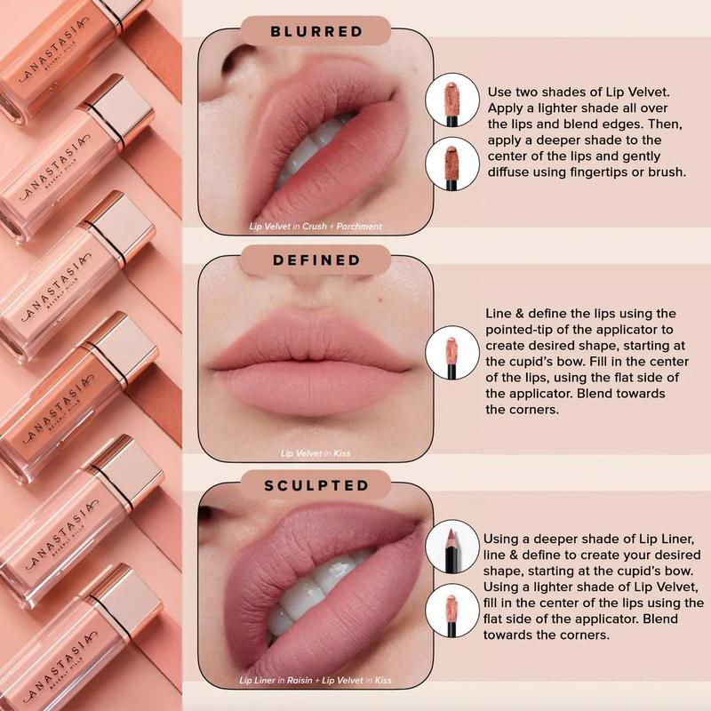 Lip Velvet is a velvet-smooth lip mousse with weightless, full pigment, true-matte color, cushioned, comfortable wear and a smoothing lip finish that allows you to line and apply with a multifunctional, teardrop-shaped cushioned wand.