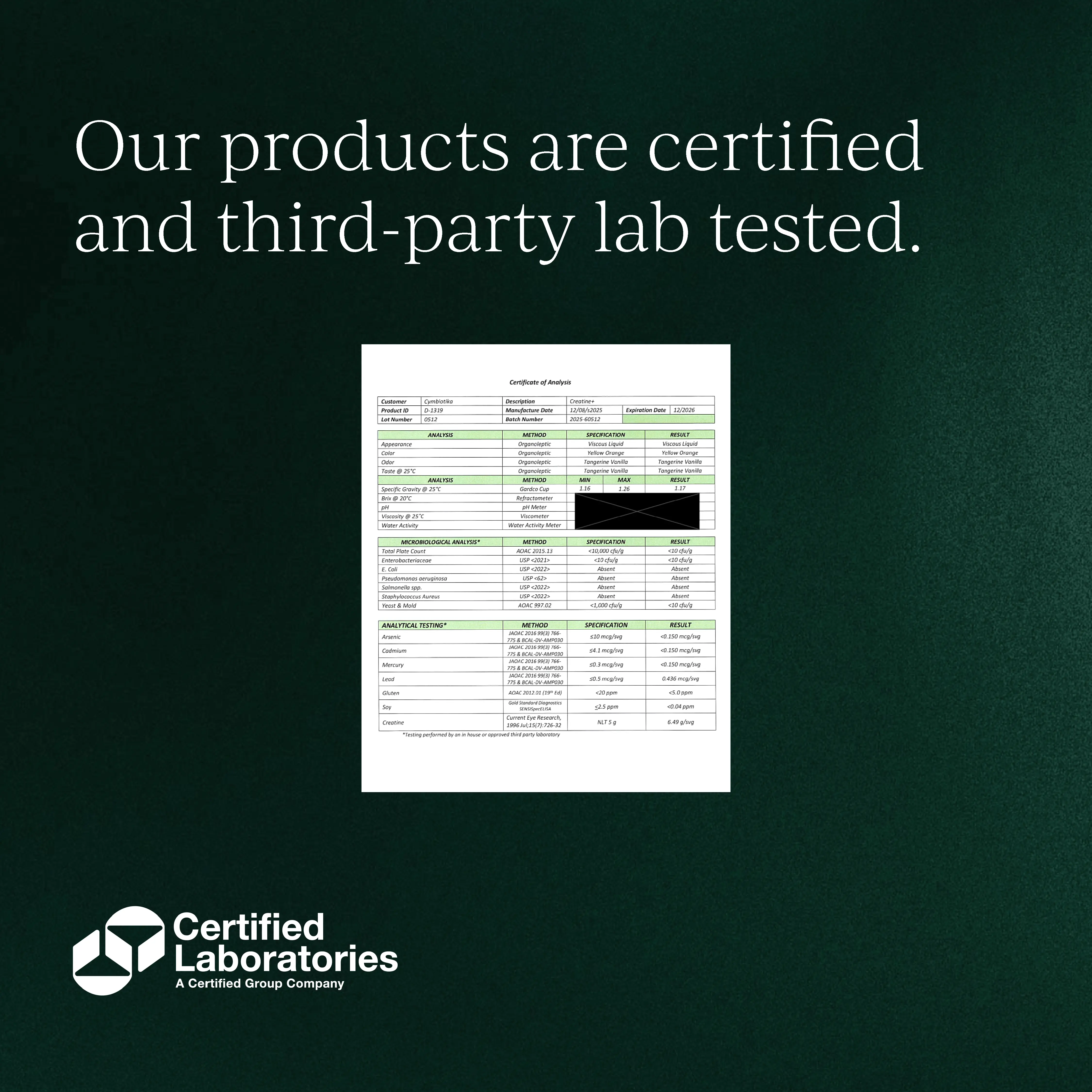 Tested for purity and safety by Certified Labs. Verified absence of harmful bacteria, heavy metals, and contaminants. Product meets all quality standards, with clear labeling and stability checks for your peace of mind.