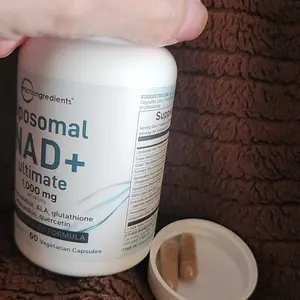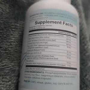 ·60 natural vegetarian capsules, containing 250mg Liposomal NAD+ (providing NAD+ 100mg) enhanced with 200mg Grape Seed Extract, 200mg Green Tea Extract, 200mg Turmeric Root, 50mg Resveratrol, 50mg Reduced Glutathione, 25mg Alpha Lipoic Acid (ALA), 10mg Quercetin, 10mg Pterostilbene, and 5mg Astaxanthin.