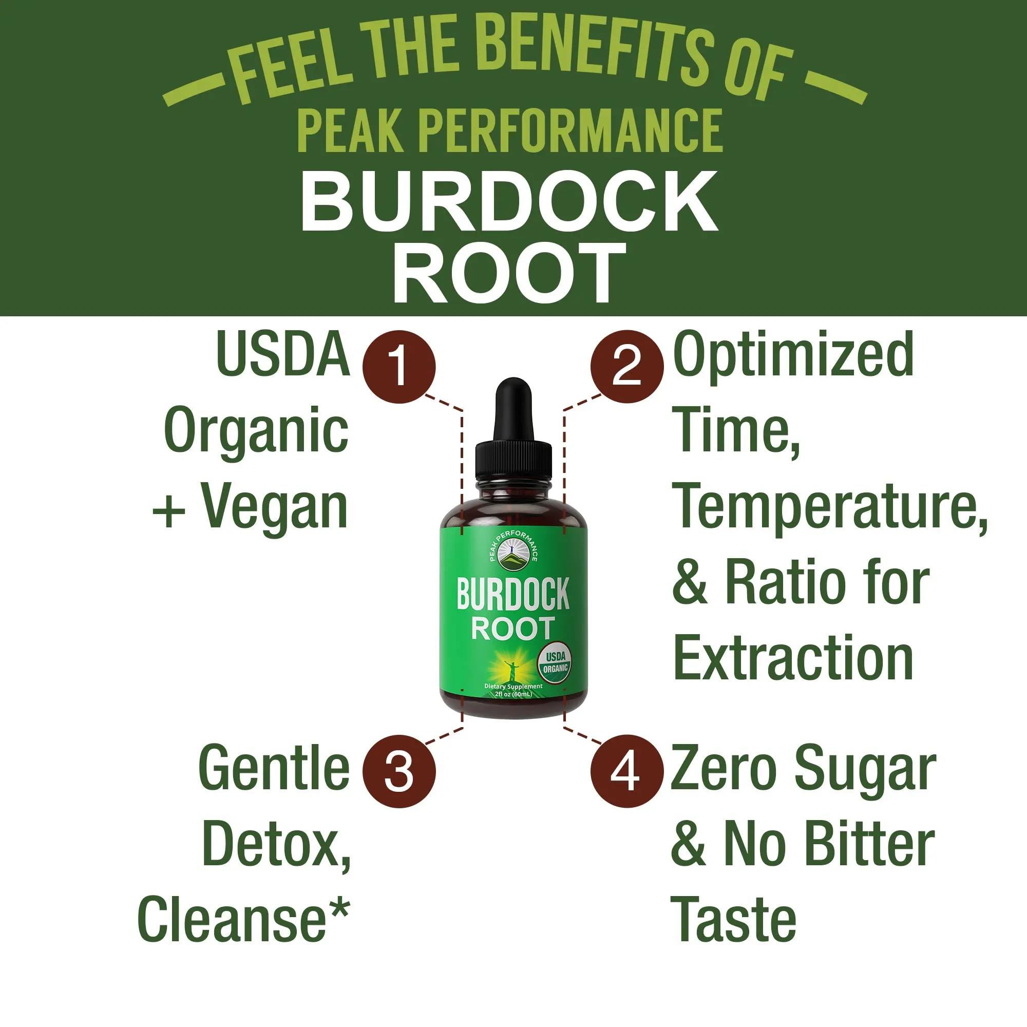 ·Powerful Yet Gentle - Peak Performance USDA Organic Burdock Root Extract Drops is a supplement for adults. You get the highest quality ingredients we could find. We created a balanced, absorbable formula with optimized time, temperature, and ratio for extraction.