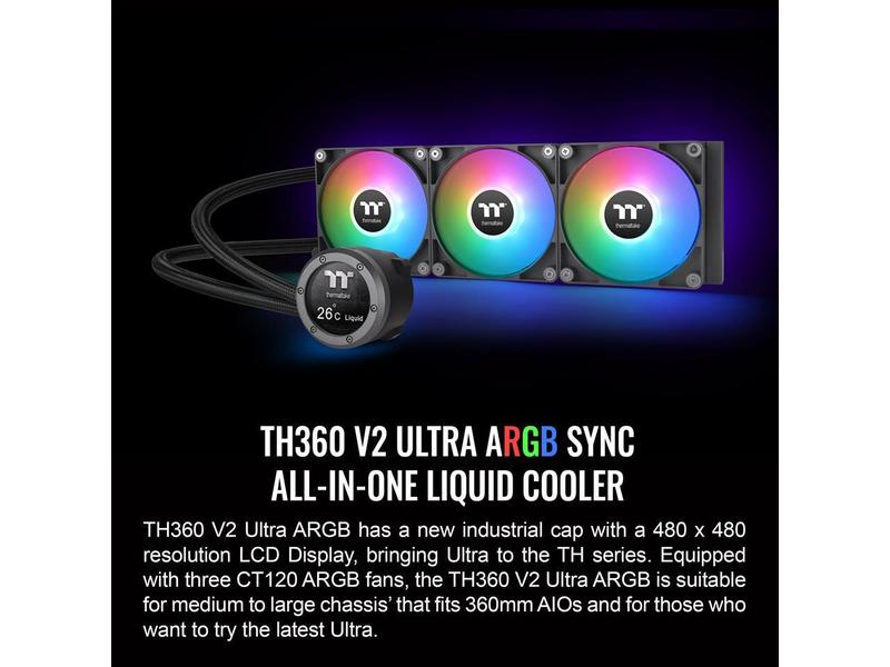 5. Thermaltake TH360 V2 Ultra ARGB Sync/AlO Liquid Cooler/ARGB Fan 120*3/PWM 500~1500rpm/Water Block 2.1" LCD/Black, CL-W384-PL12SW-A - Supports Intel LGA 1851/1700 and AMD AM5/AM4