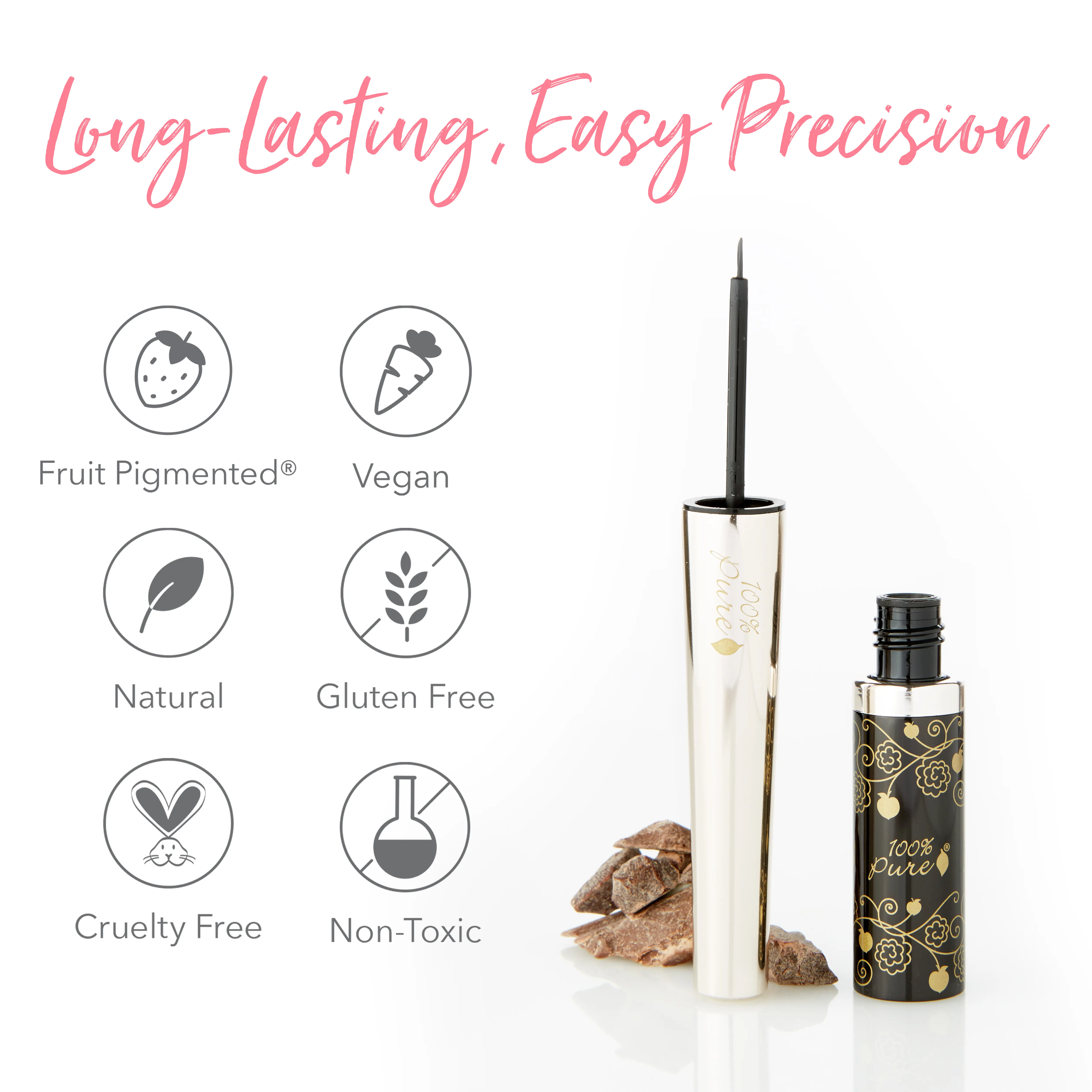 Our silky smooth, vegan and cruelty-free long lasting liquid eyeliner uses rich pigment from black tea leaves to line and define your eyes with deep, dramatic color. This formula is water-resistant, smudge-proof, and long-lasting for all day wear. Made with hydrating aloe and nourishing cocoa butter and free of artificial fragrances, chemical preservatives, and toxic petrochemical dyes. Gentle enough for sensitive eyes.