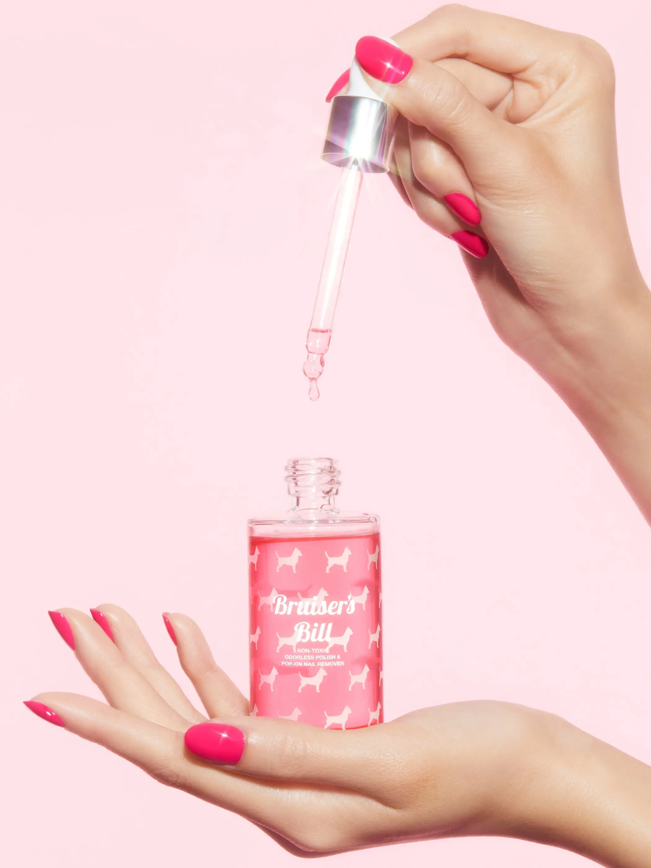 No harsh soaking or scraping here. Liquid Glass Lacquer removes easily with regular nail polish remover. We highly recommend our multi award-winning, best-selling Bruiser's Bill Non-Toxic, Odorless Polish & Pop-On Nail Remover which leaves nails and skin feeling hydrated and conditioned, instead of dry and stripped. Now available in a special, limited-edition hot pink formula and iconic Legally Blonde x Static Nails packaging. Unlike traditional removers that have offensive, toxic odors and aggressive, damaging industrial solvents that leave skin and nails dry and stripped of natural oils, Bruiser's Bill Non-Toxic, Odorless Polish & Pop-On Nail Remover has absolutely ZERO smell, is 100% non-toxic, gentle yet highly effective, and safe to use.