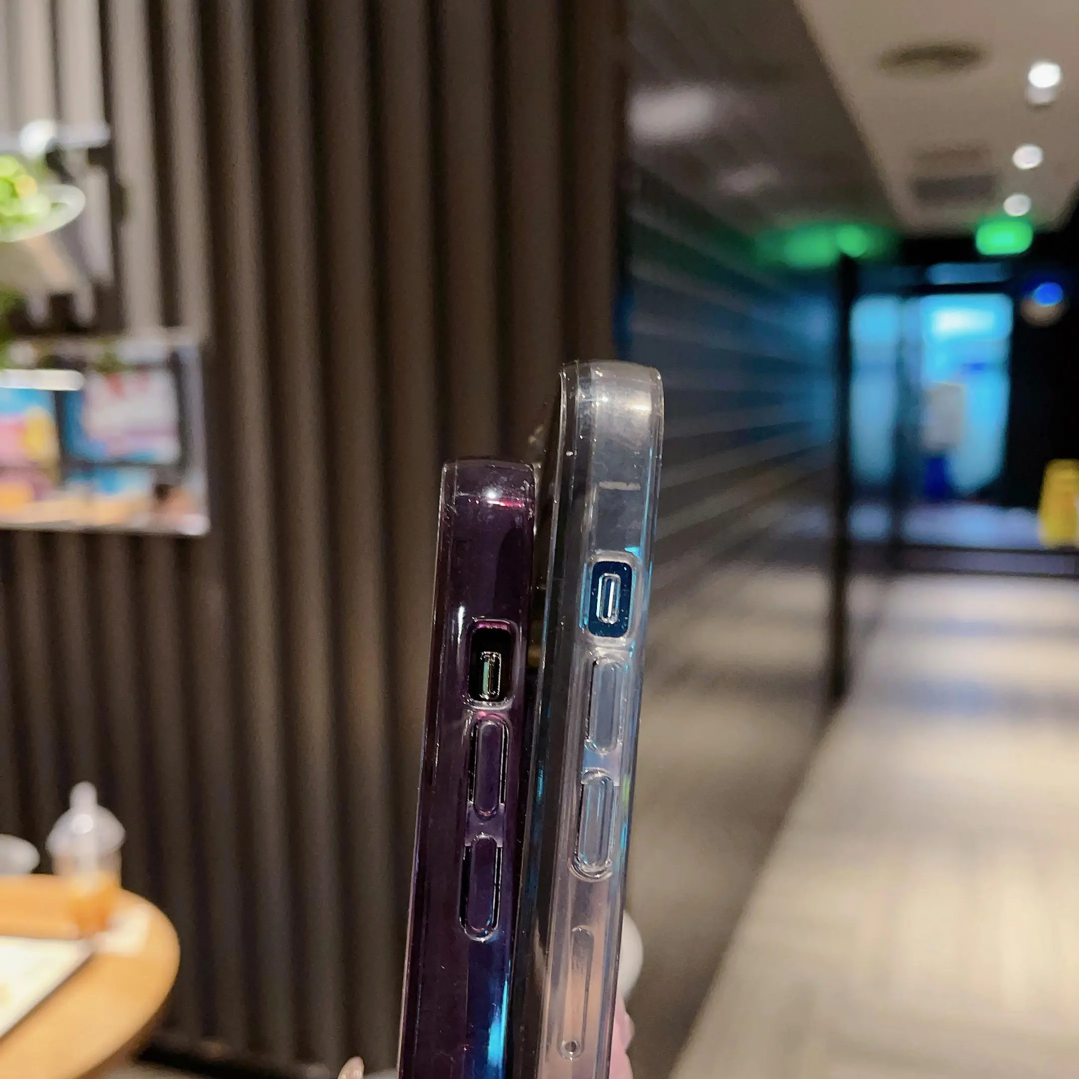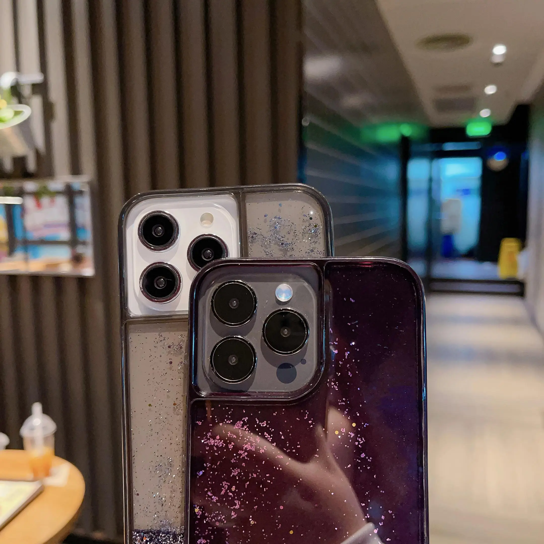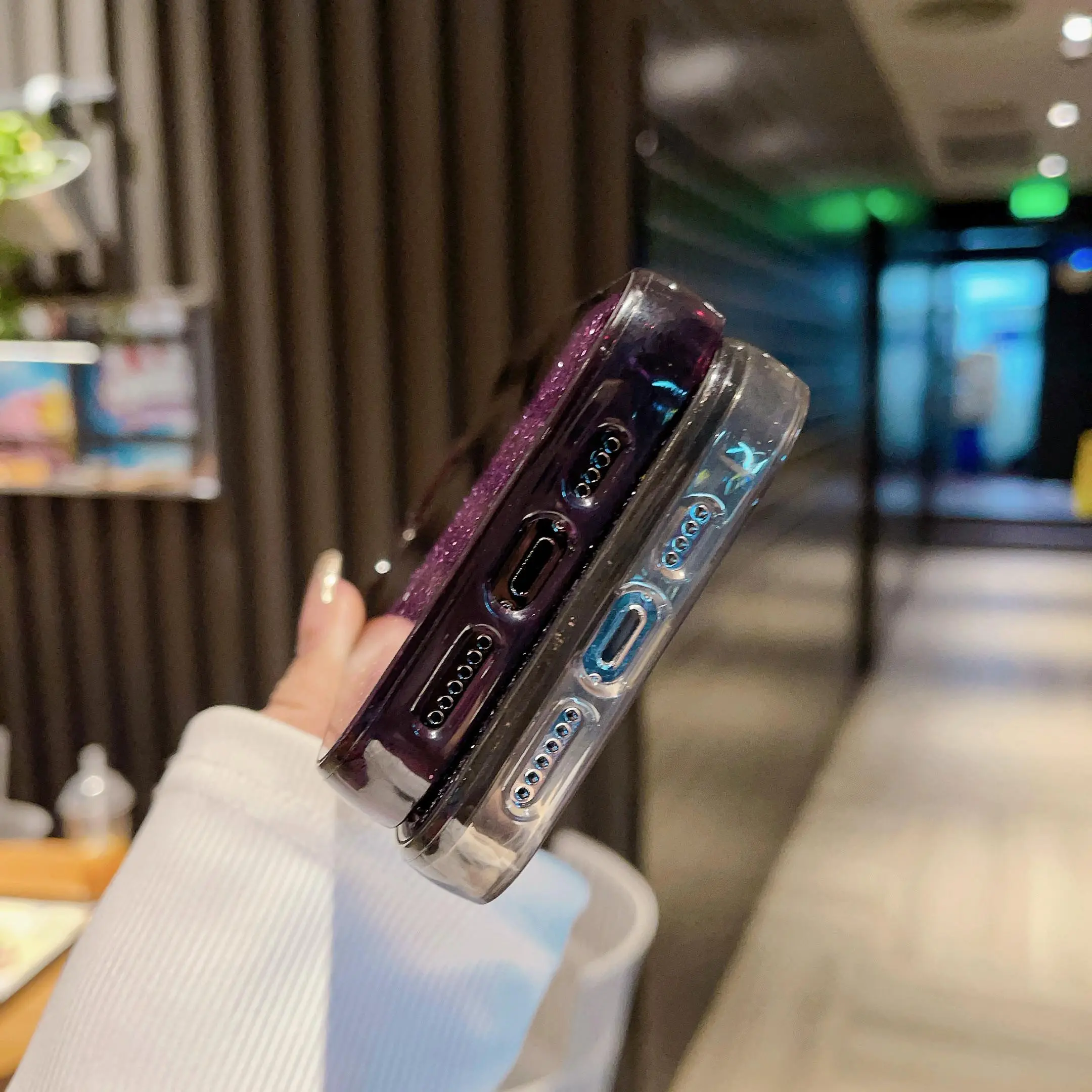 ·Clear case with purple glitter.