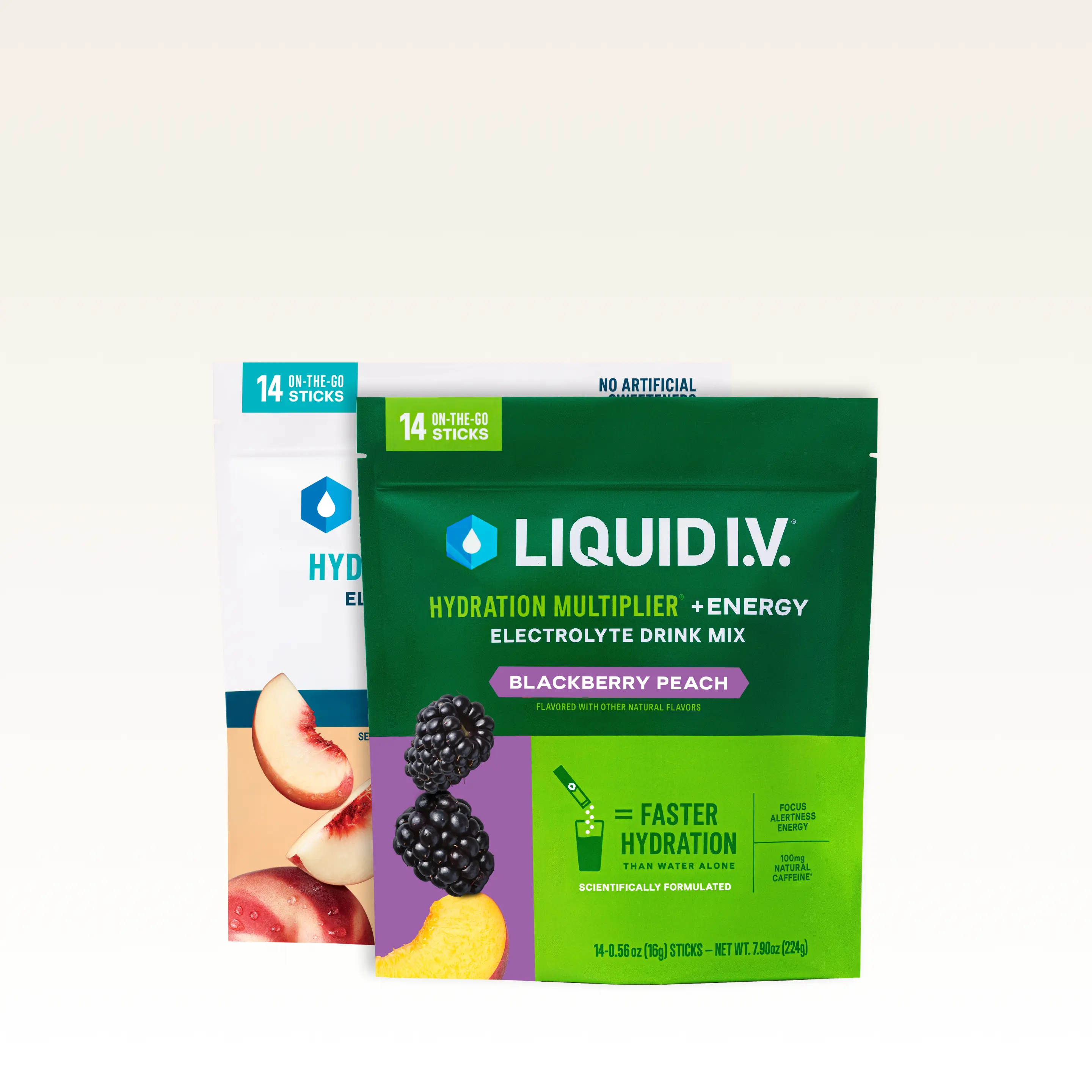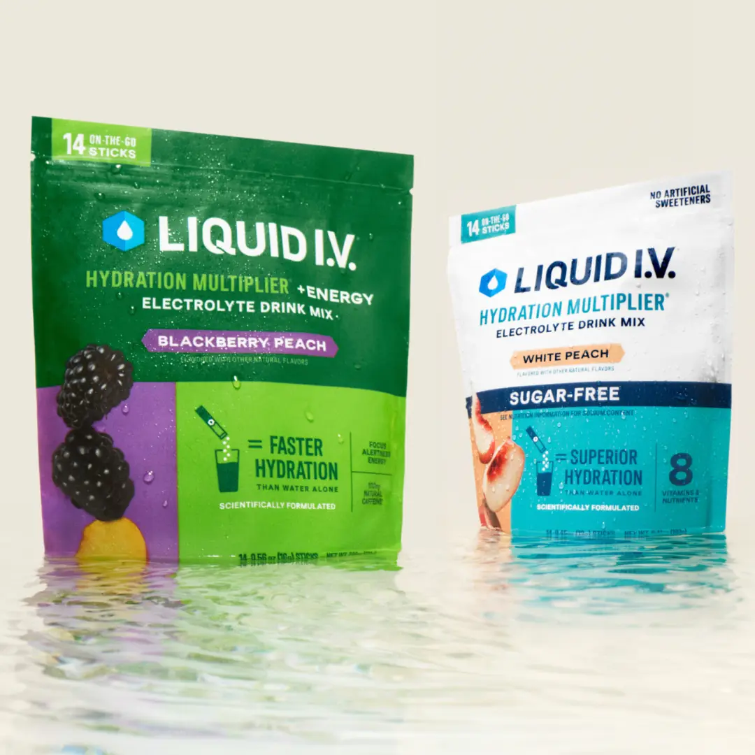 Summer never ends with our Get Peachy Bundle. Experience two juicy flavors in one hydrating bundle. Ripe for the picking and equally as delicious, you'll get 1 pouch of our top-selling Hydration Multiplier® Sugar-Free White Peach, and 1 pouch of NEW Hydration Multiplier® +Energy Blackberry Peach.