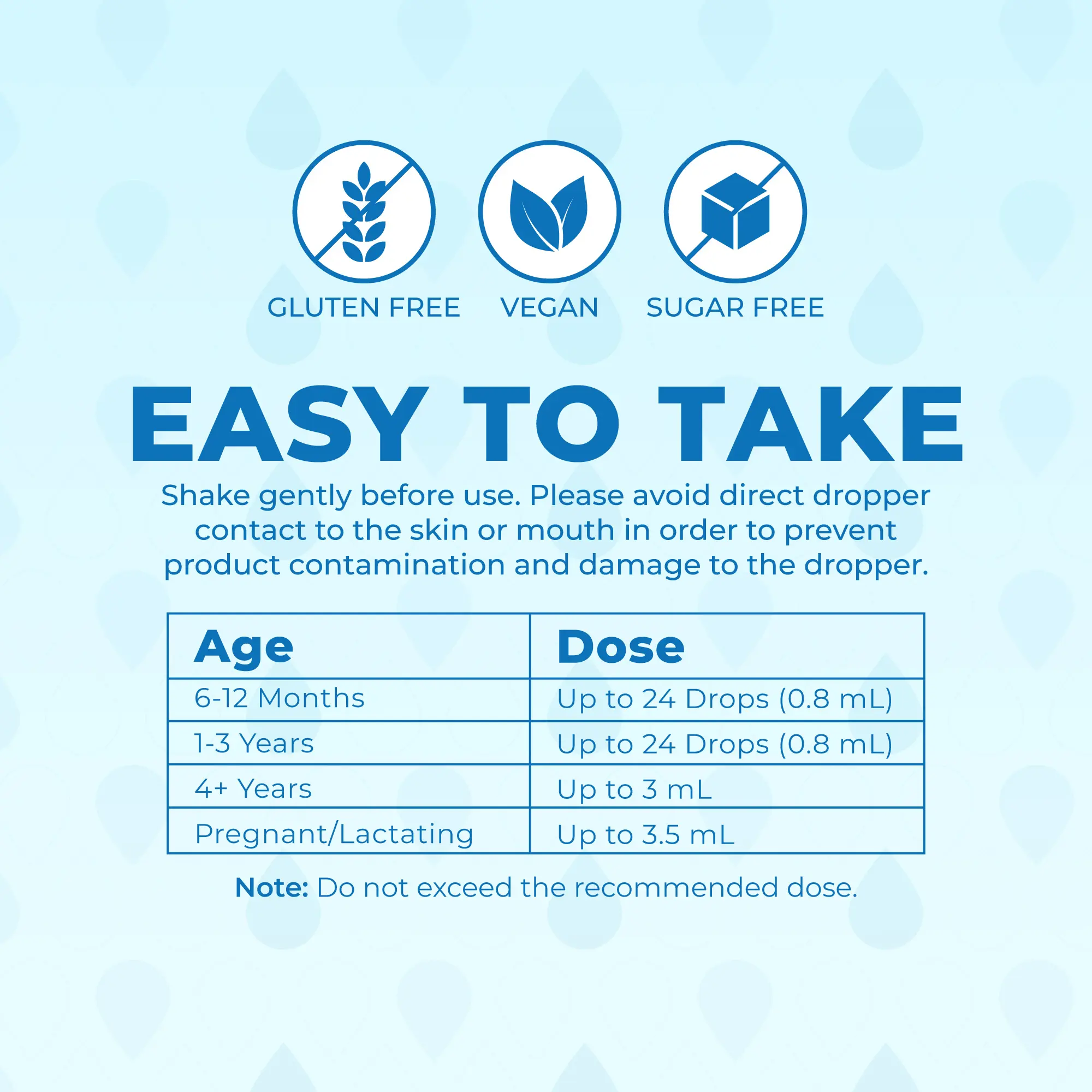 Suggested Use: Shake gently before use. Please avoid direct dropper contact to the skin or mouth in order to prevent product contamination and damage to the dropper. Do not exceed the recommended dose.