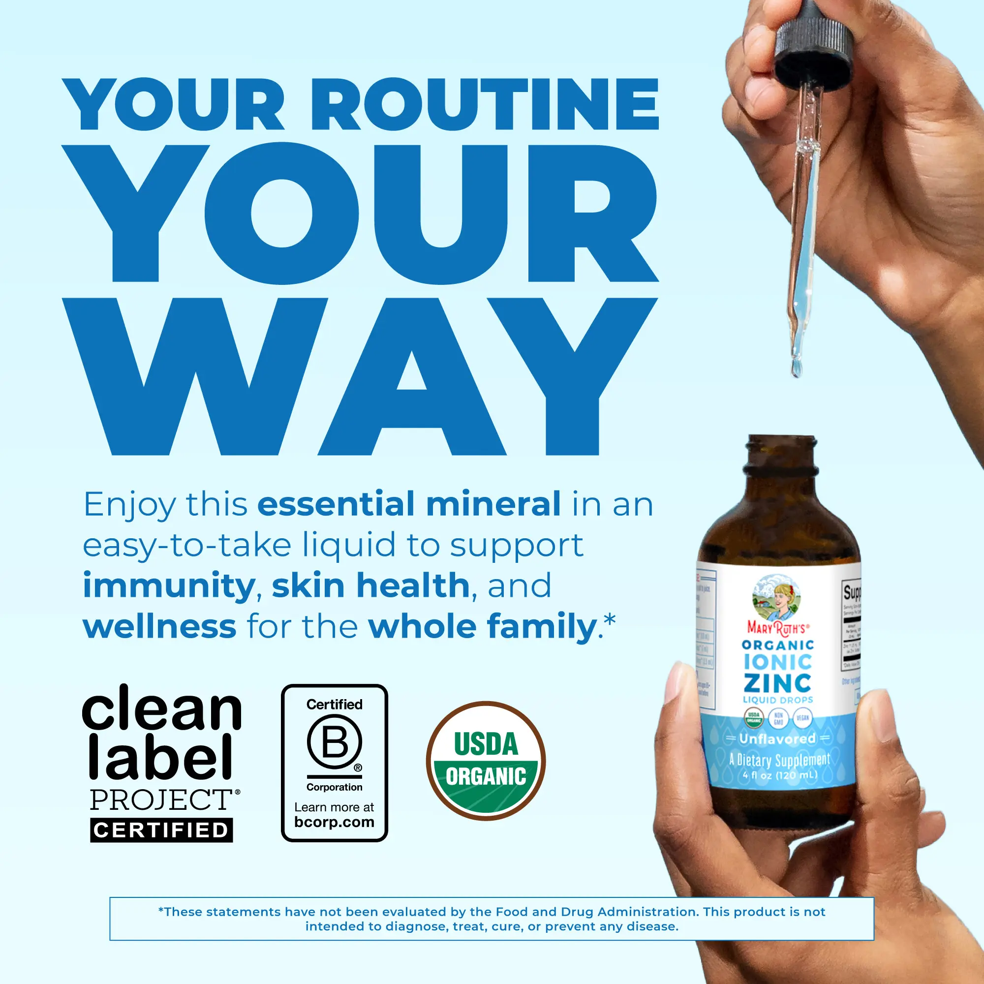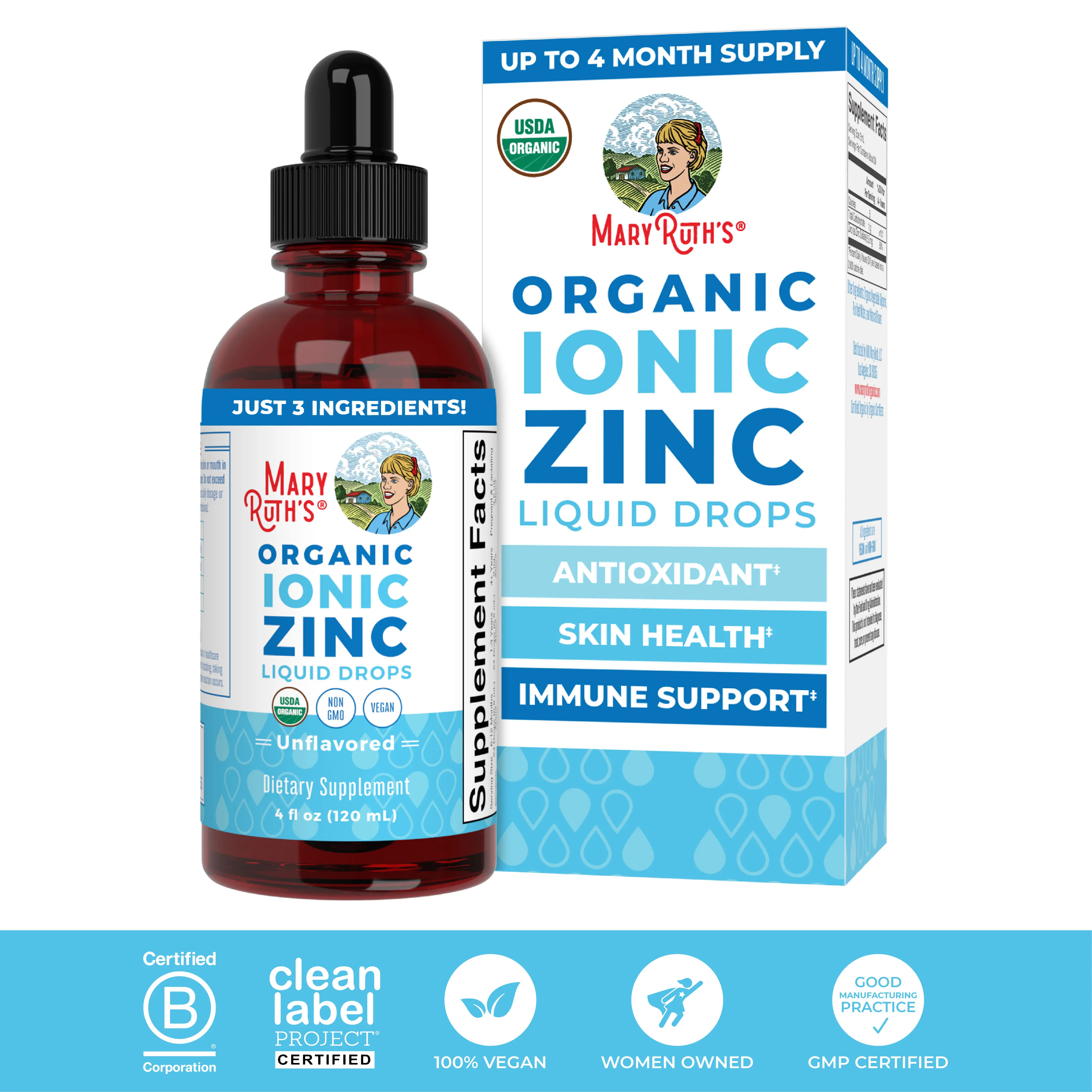 For Most Lifestyles: MaryRuth's Liquid Ionic Zinc Liquid Drops are USDA Organic, Non-GMO, Vegan, Made in a GMP Facility. Dairy Free, Nut Free, Gluten Free, Soy Free, Sugar Free. Family Formulated. B Corp Certified. Clean Label Project Certified. Women Owned Business.