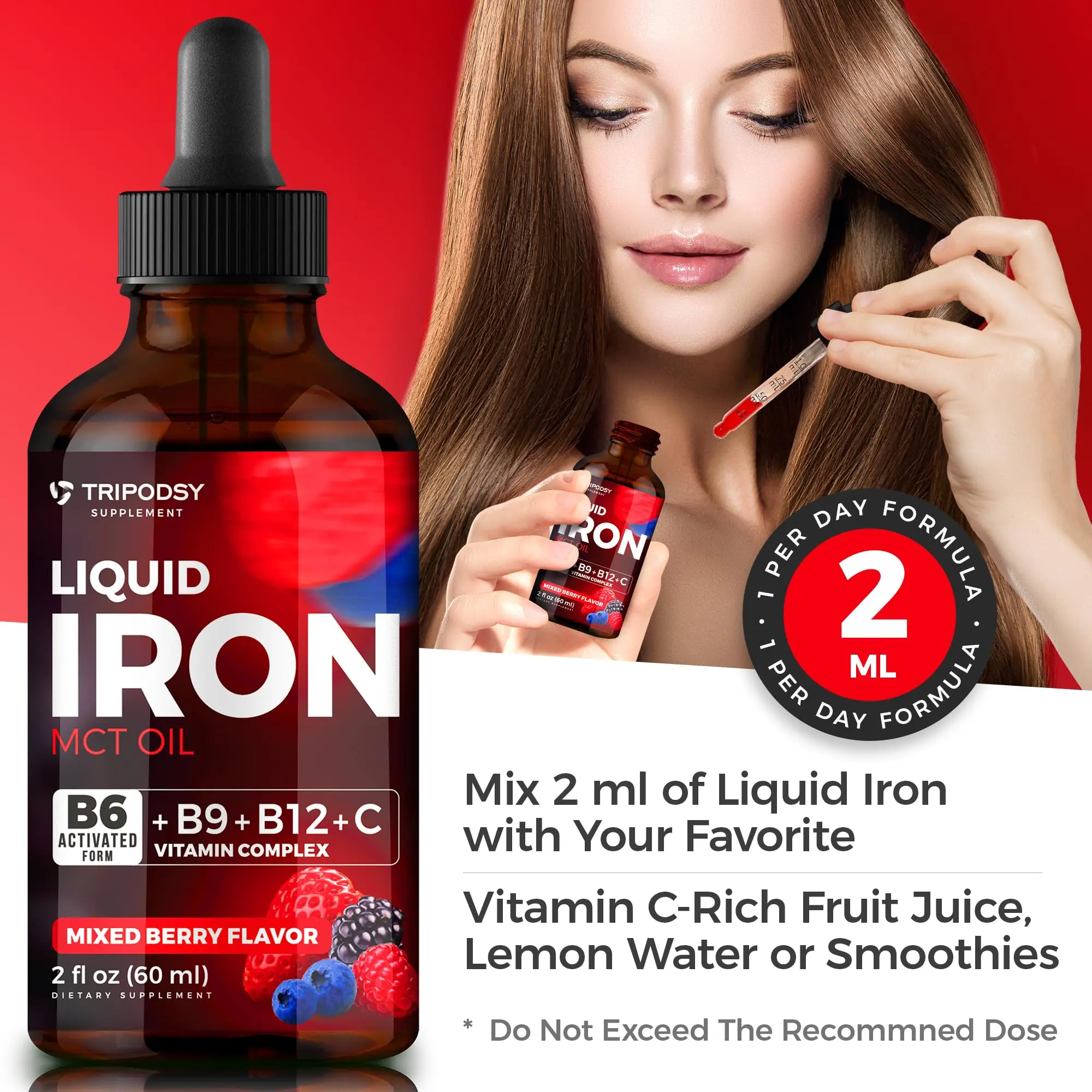 Liquid Iron supplements, Iron Drops, with B6, B9, B12, C, Vitamin Iron for Anemia, Blood Build, MCT Oil, Energy Support Healthcare Fitness Dietary Oxygen Edible Optimum Liquid Iron Vitamins Women Iron Deficiency