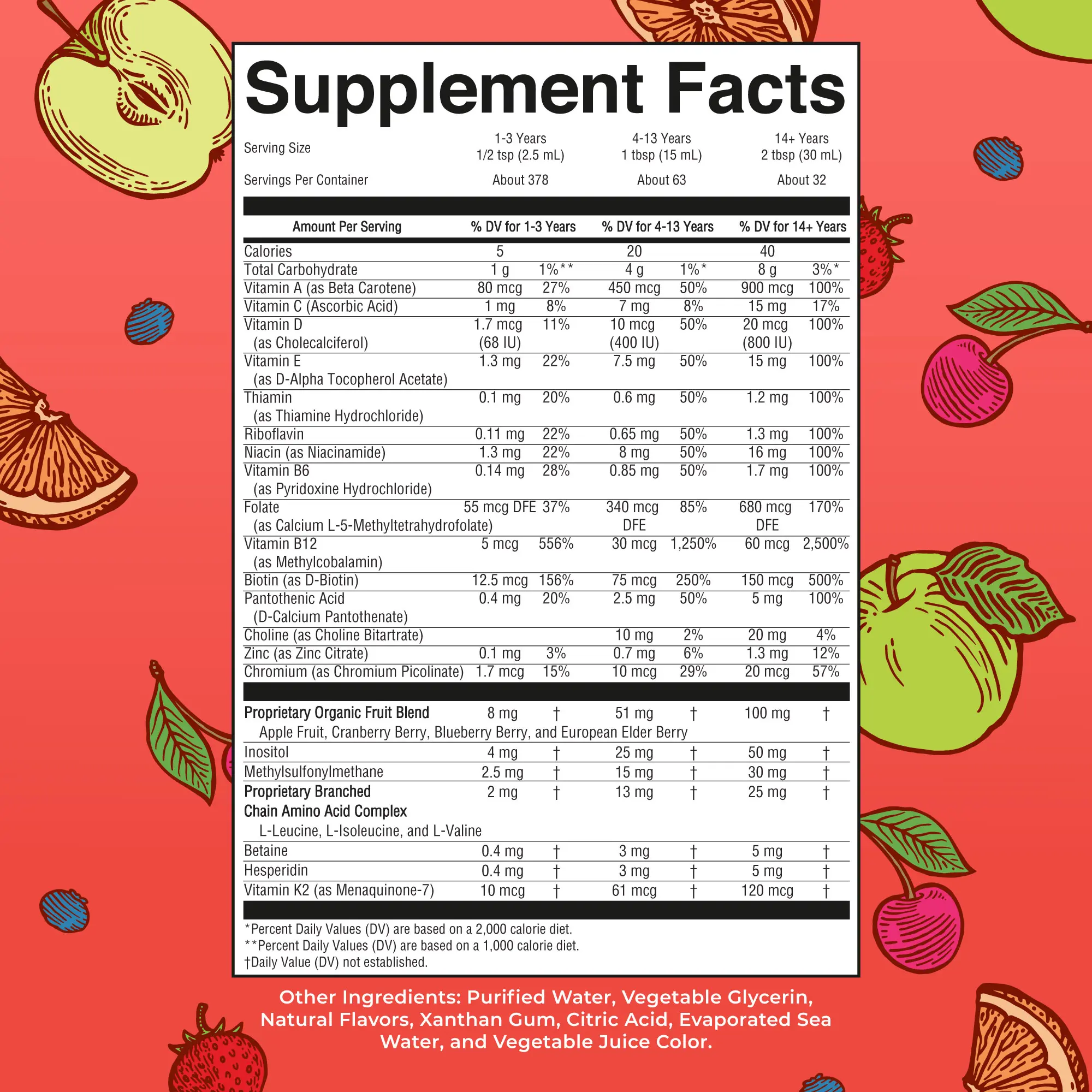 Provide important nutrients to your body in an easy-to-take liquid form! This multivitamin, made for the whole family, includes essential vitamins (including K2 as MK-7!), plus minerals, and a fruit blend with elderberry.