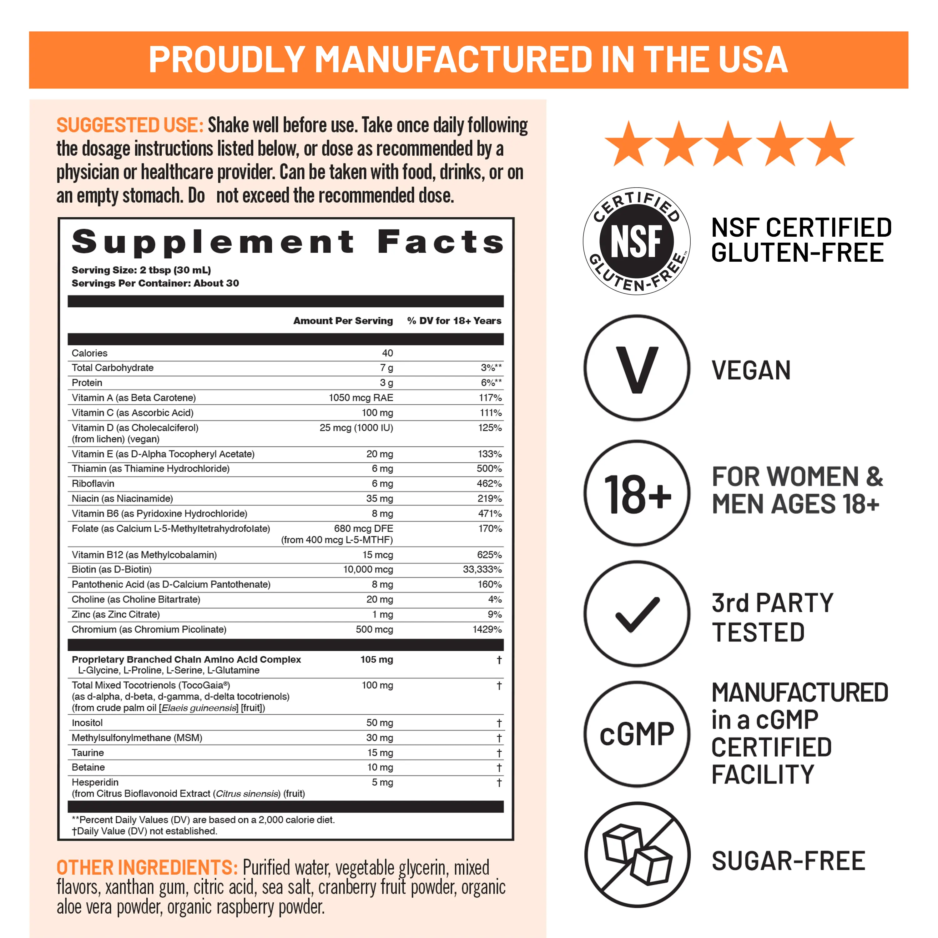 ·3rd PARTY TESTED, USA MANUFACTURED: Liquid Multivitamin for Hair Growth is 3rd party tested for purity and efficacy and manufactured in the USA in a cGMP-certified facility. It is sugar free, gluten free, vegan, and does not contain wheat, dairy, eggs, soy, milk, peanuts, tree nuts, shellfish, or sesame.
