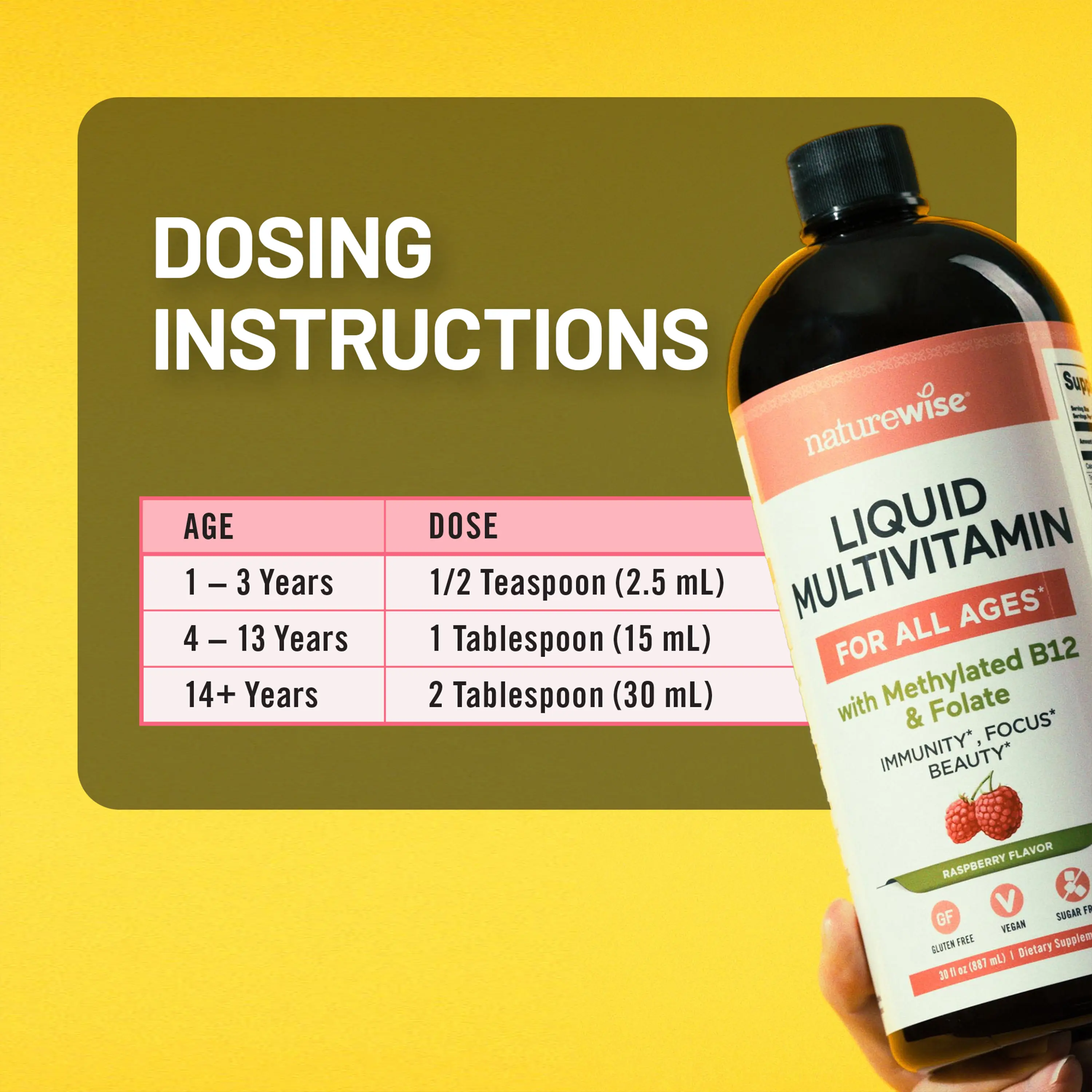 ·Dosing Instructions: Say goodbye to hard-to-swallow pills or capsules. For ages 2-3 years: 1/2 teaspoon, 4-13 years: 1 tablespoon, 14+ years: 2 tablespoons. Shake well before use. Refrigerate after opening.