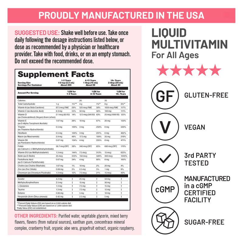 ·Liquid Multivitamin for Ages 1 & Up: This delicious liquid multivitamin is easy to take every day to support energy levels and immune health. This premium multivitamin is designed for the whole family.