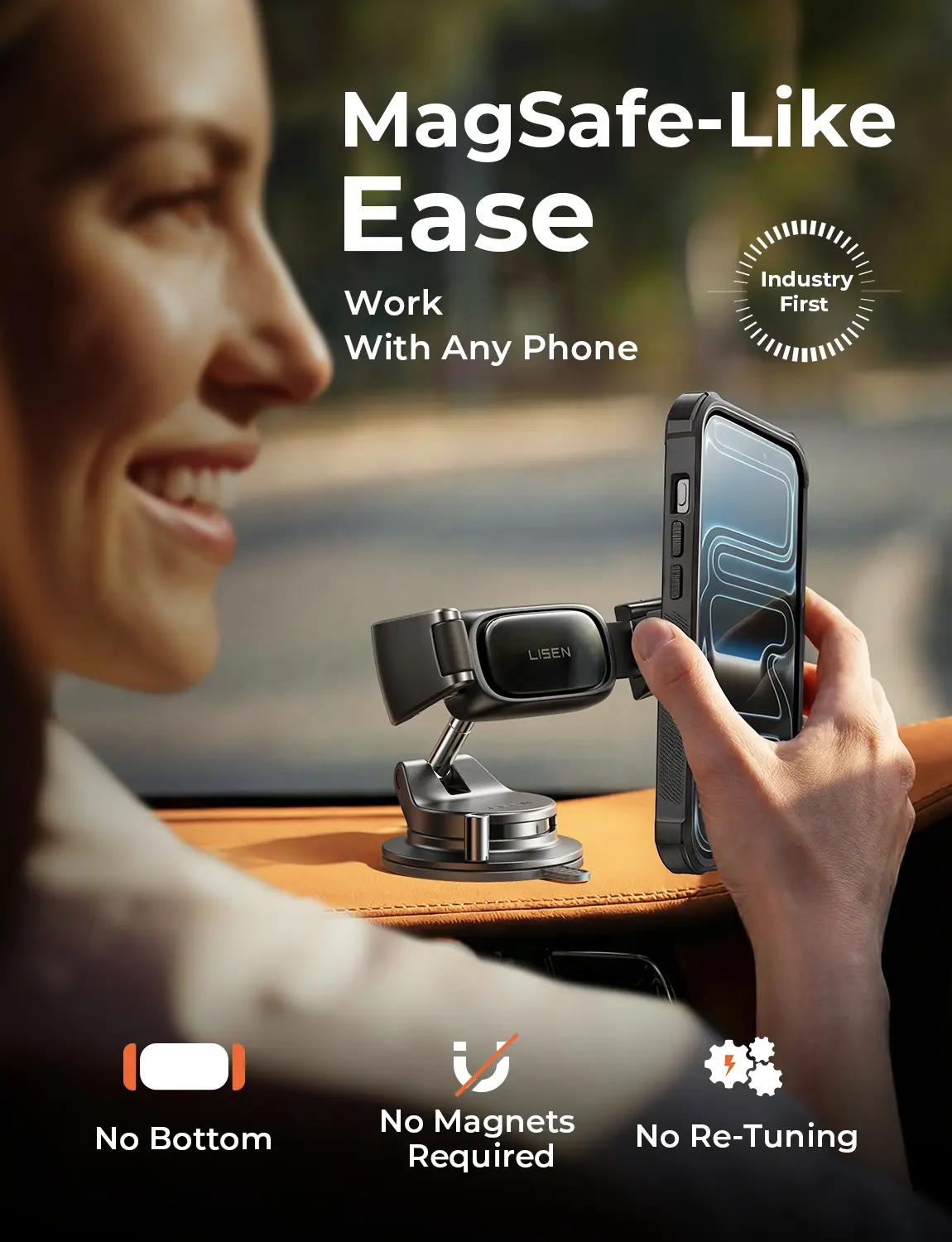 The Lisen Maxfit Car Phone Holder is a 360-degree rotating phone mount. It features an upgraded clip for easy attachment and removal. Suitable for 4-7 inch smartphones like iPhone, Samsung, Google, and Nokia. This holder ensures a secure fit without leaving any residue.