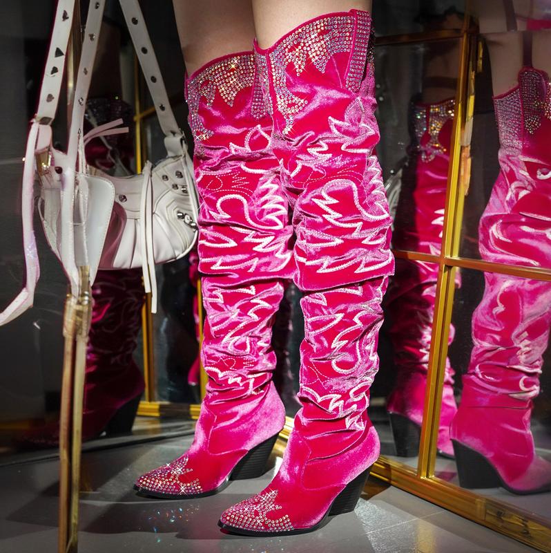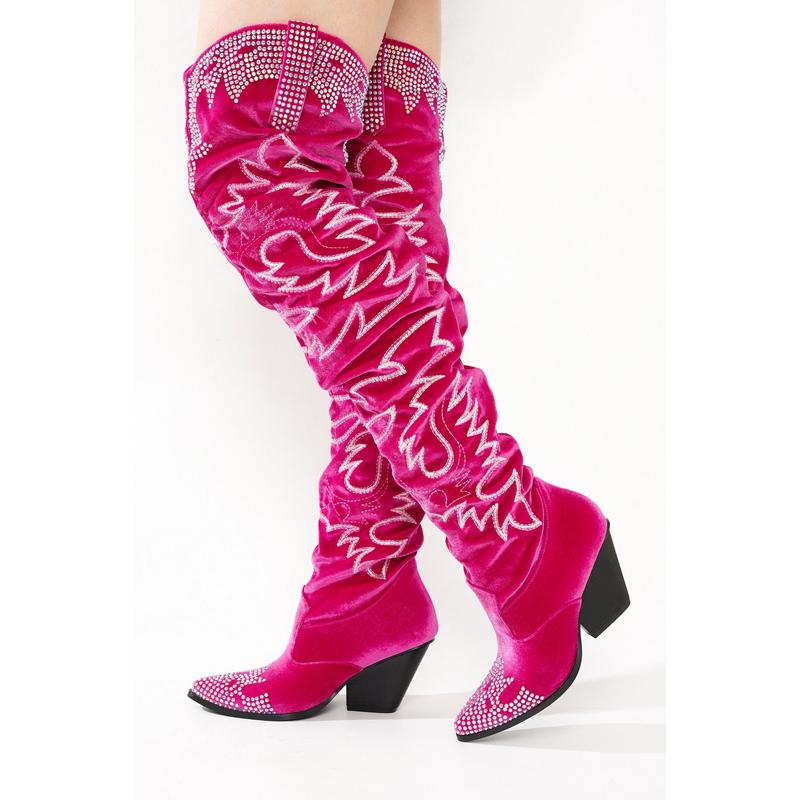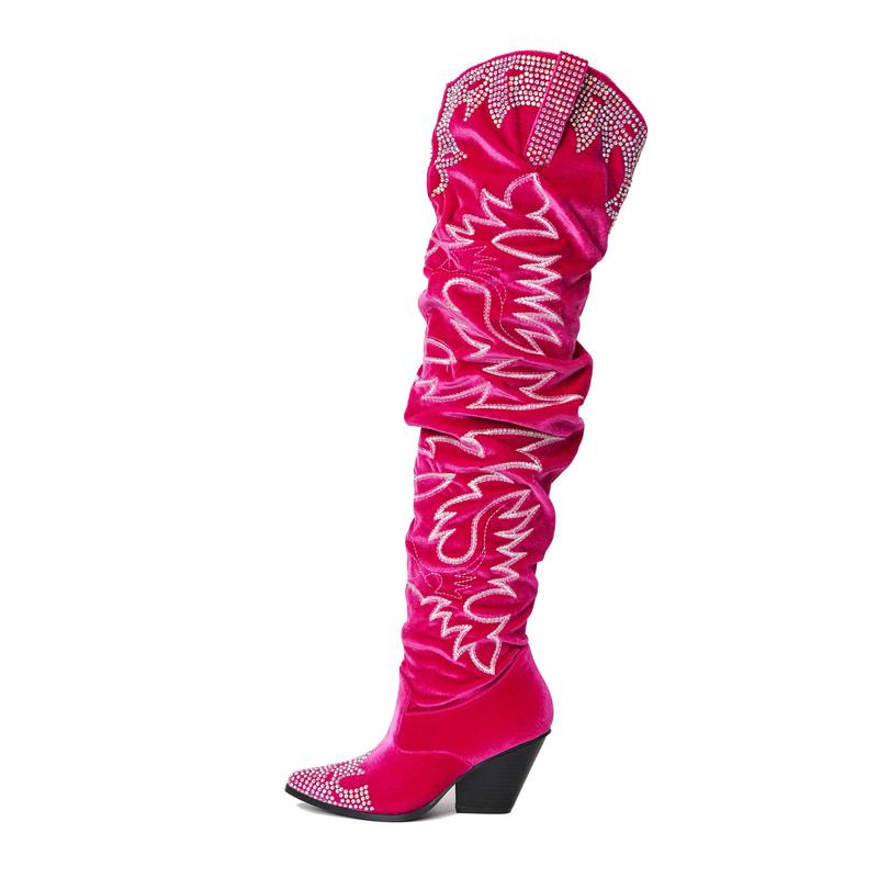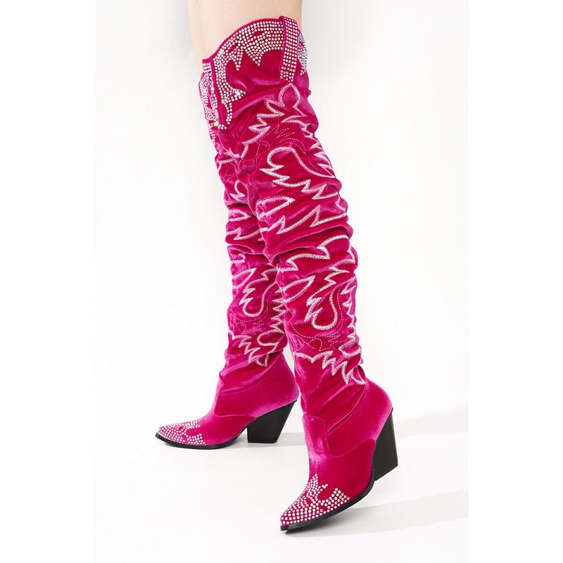 CAPE ROBBIN Lish Velvet Rhinestone Thigh High Slouchy Western Boots Fuchsia Round Toe Memory Foam Insole Comfortable Walking Shoes for Women