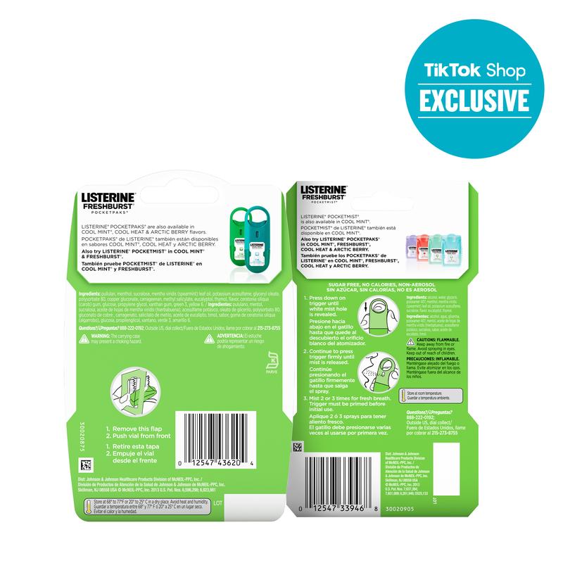 Boost your mouthwash routine on-the-go with this dynamic Listerine® Duo Pack featuring PocketPaks Fresh Breath Strips and Pocketmist Fresh Breath Spray. (Available in Cool Mint and Freshburst Flavors)