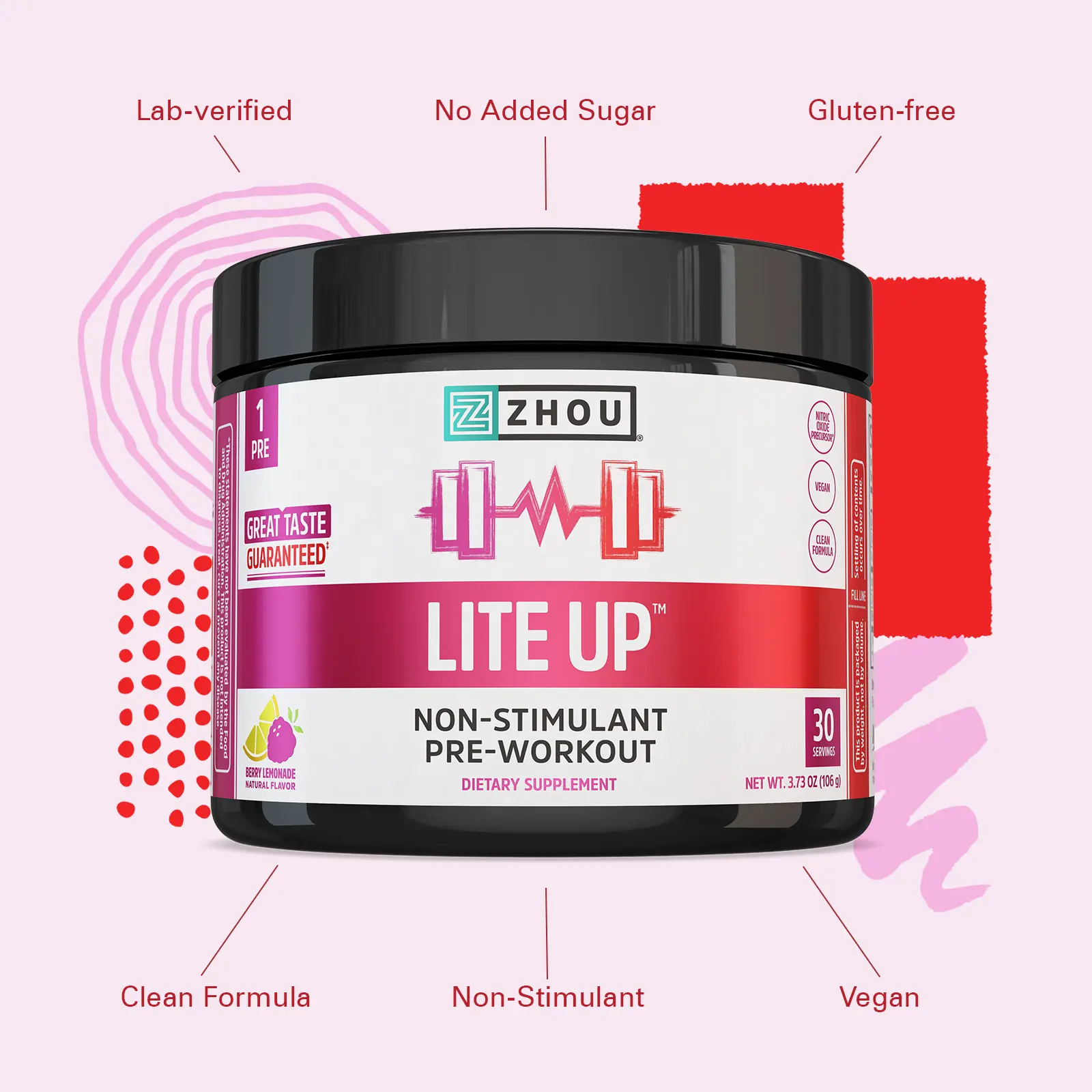 Lite Up is formulated without caffeine so everyone can enjoy a good workout. Perfect for those looking for a non-stimulant pre-workout.