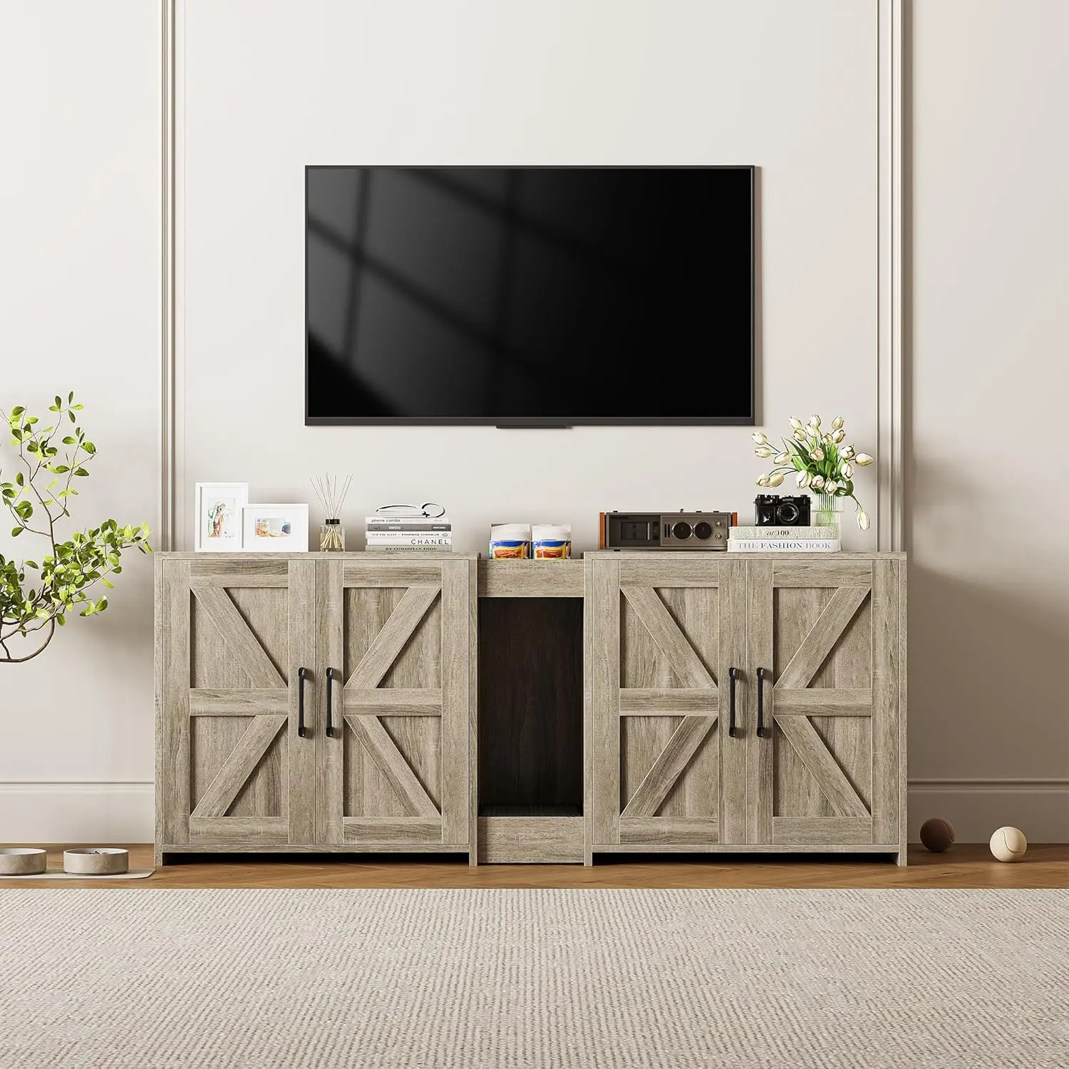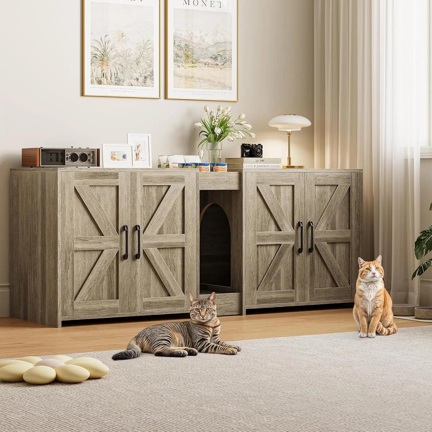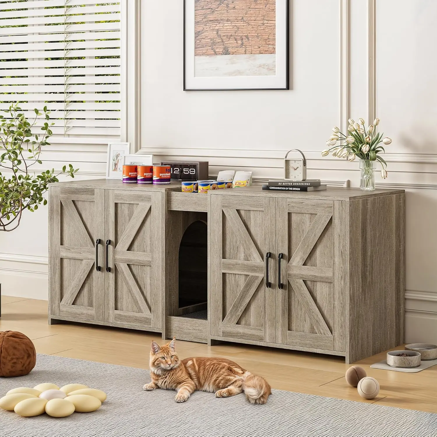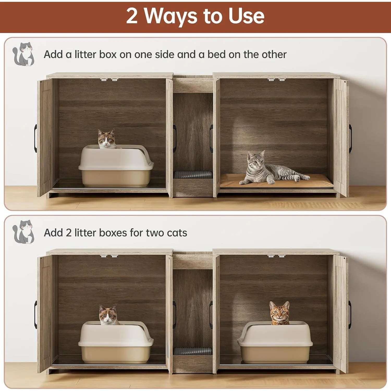·Ample Storage Space: The litter box furniture includes 2 open storage compartments, facilitating organized and efficient storage of pet supplies. The countertop, enhanced with a railing design, ensures items remain stable and secure, enhancing safety during use.